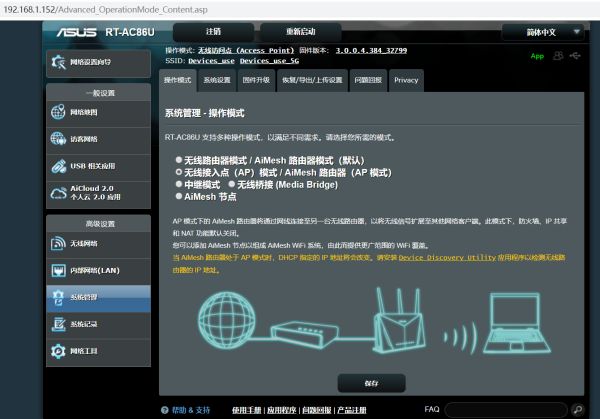华硕RT-AC86U路由器 由5种操作模式,默认为无线路由模式。