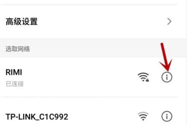 3、进入无线网络页面后,找到已连接的WIFI(修改DNS必须连接到相应的WIFI),然后选择右侧符号。
