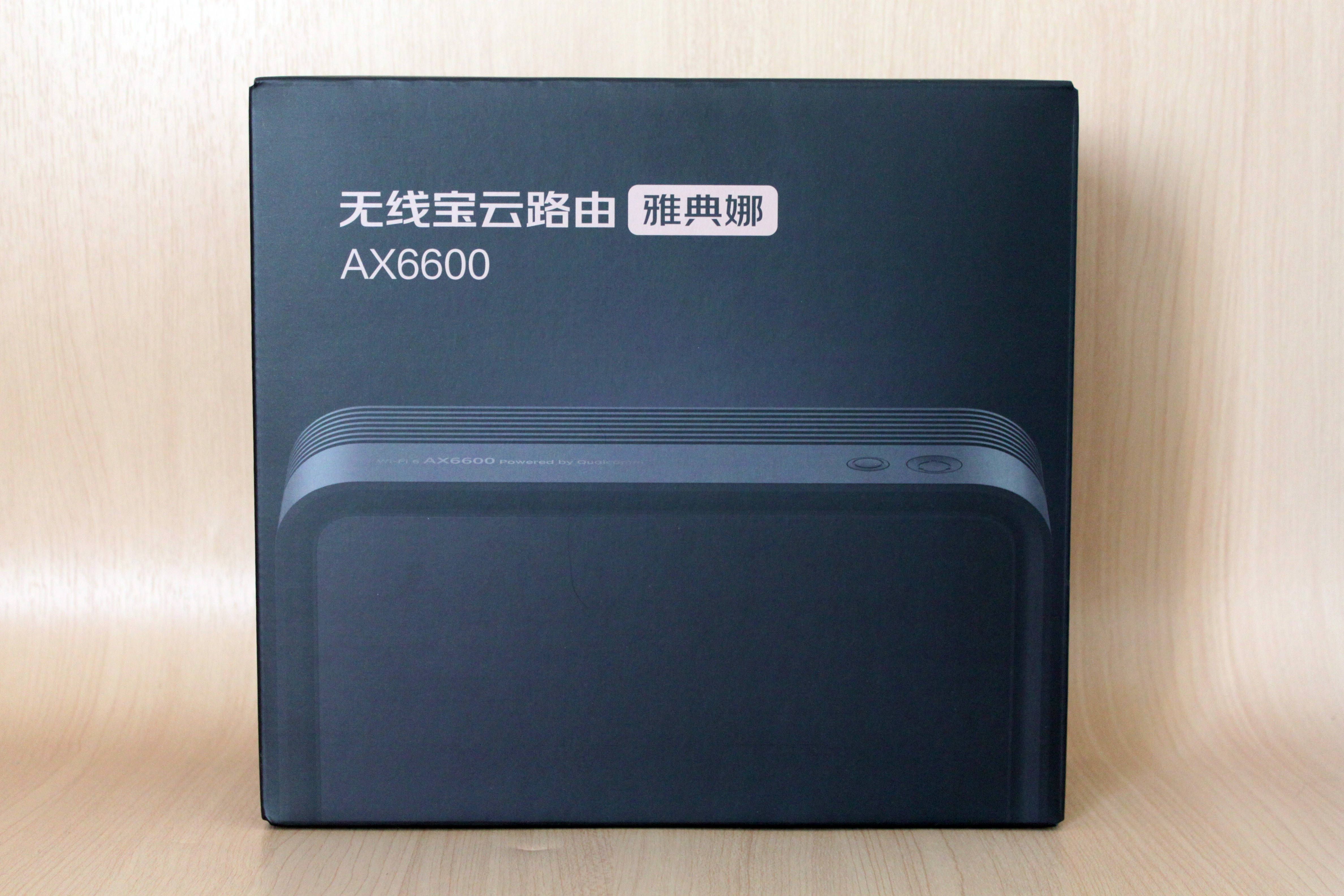 无线宝云路由 雅典娜AX6600采用了环保的纸质外包装,黑色的配色,看起来更加沉稳。在包装盒上可以看到产品的名称和产品一部分的实物图,这种犹抱琵琶半遮面的设计,让产品更具神秘感,也让人对产品充满期待。