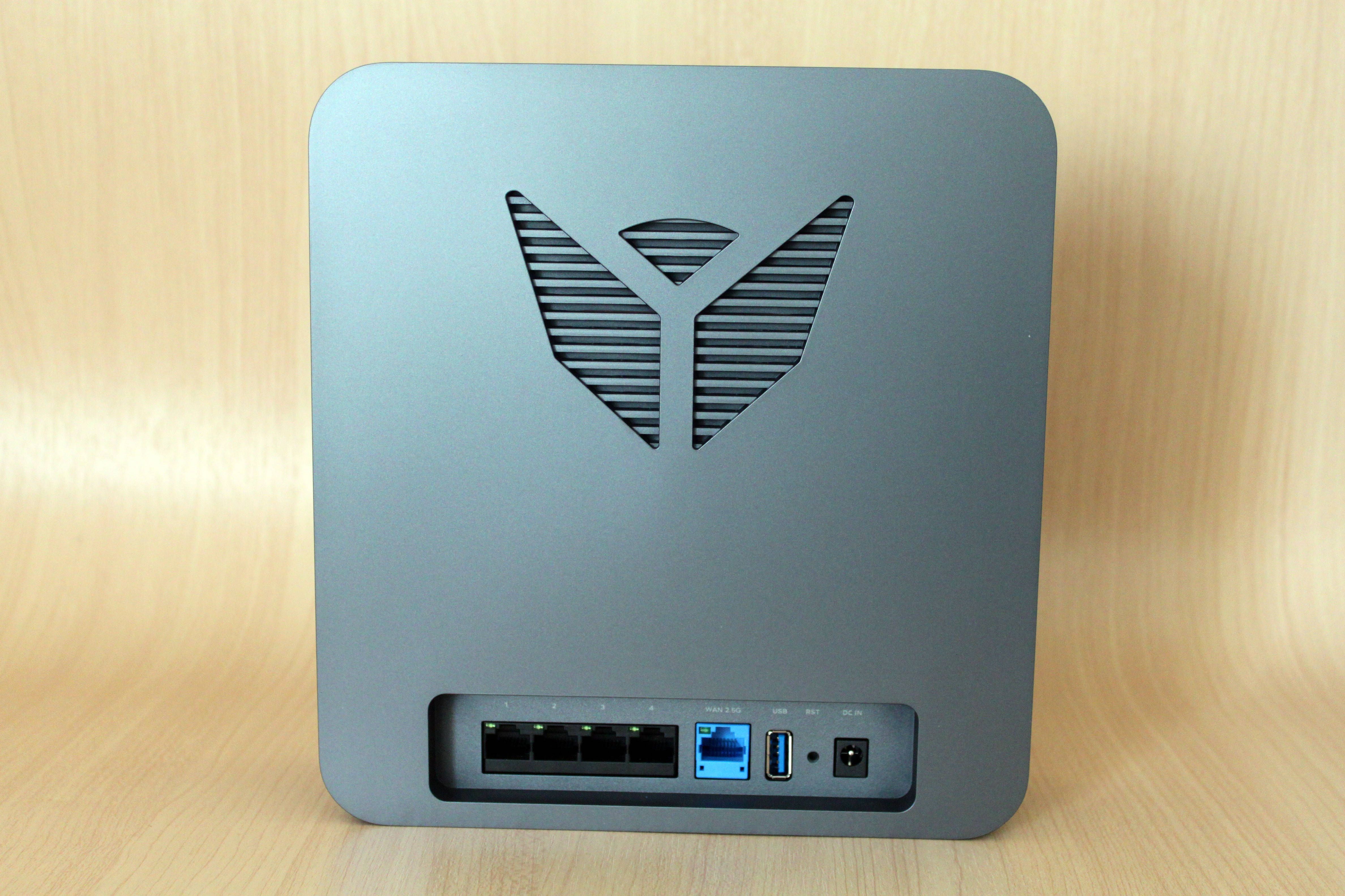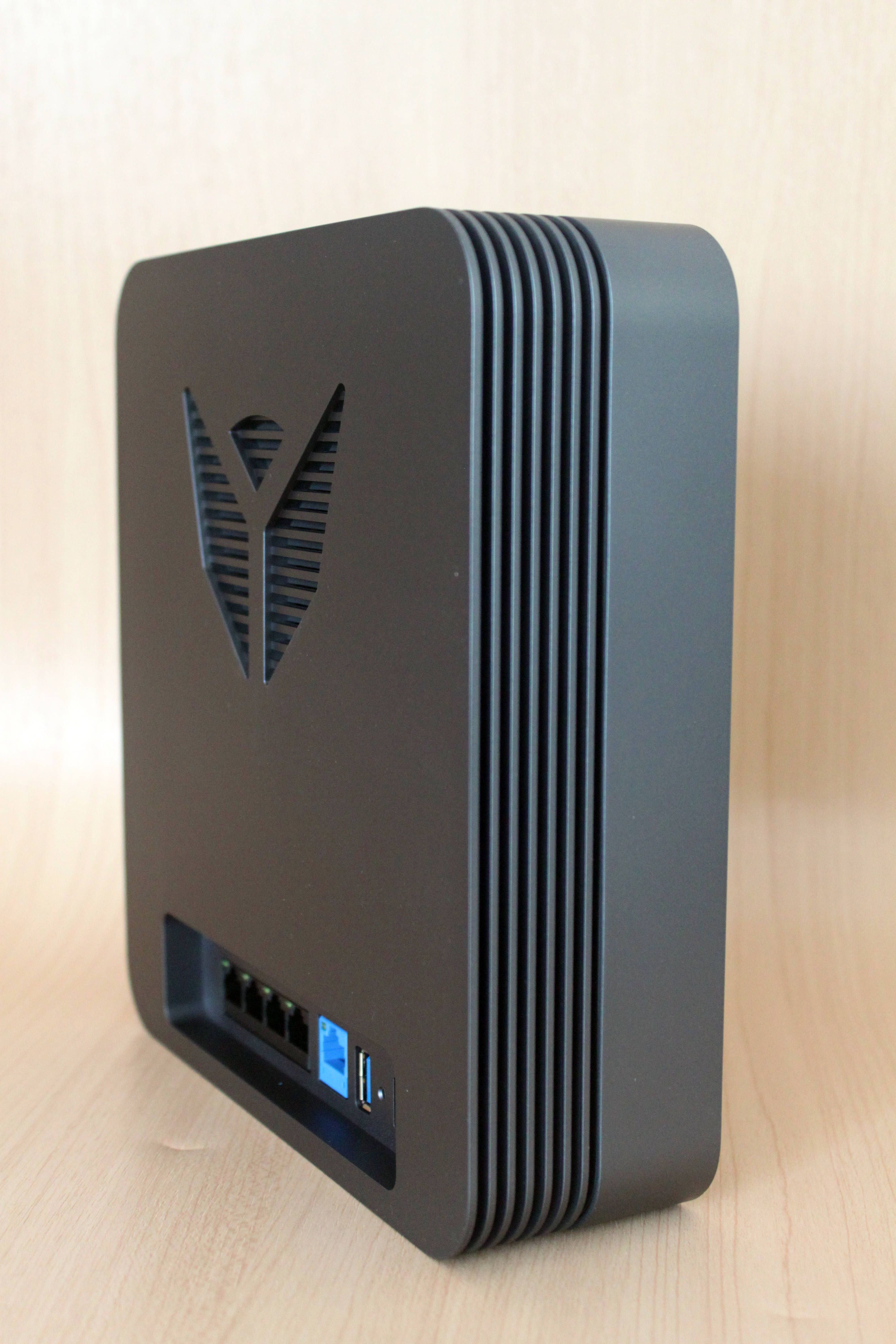 从雅典娜路由器的侧面来看,整体机身不是很厚重,机身的一般都采用了格栅的散热设计,保证了整机运行时的稳定。