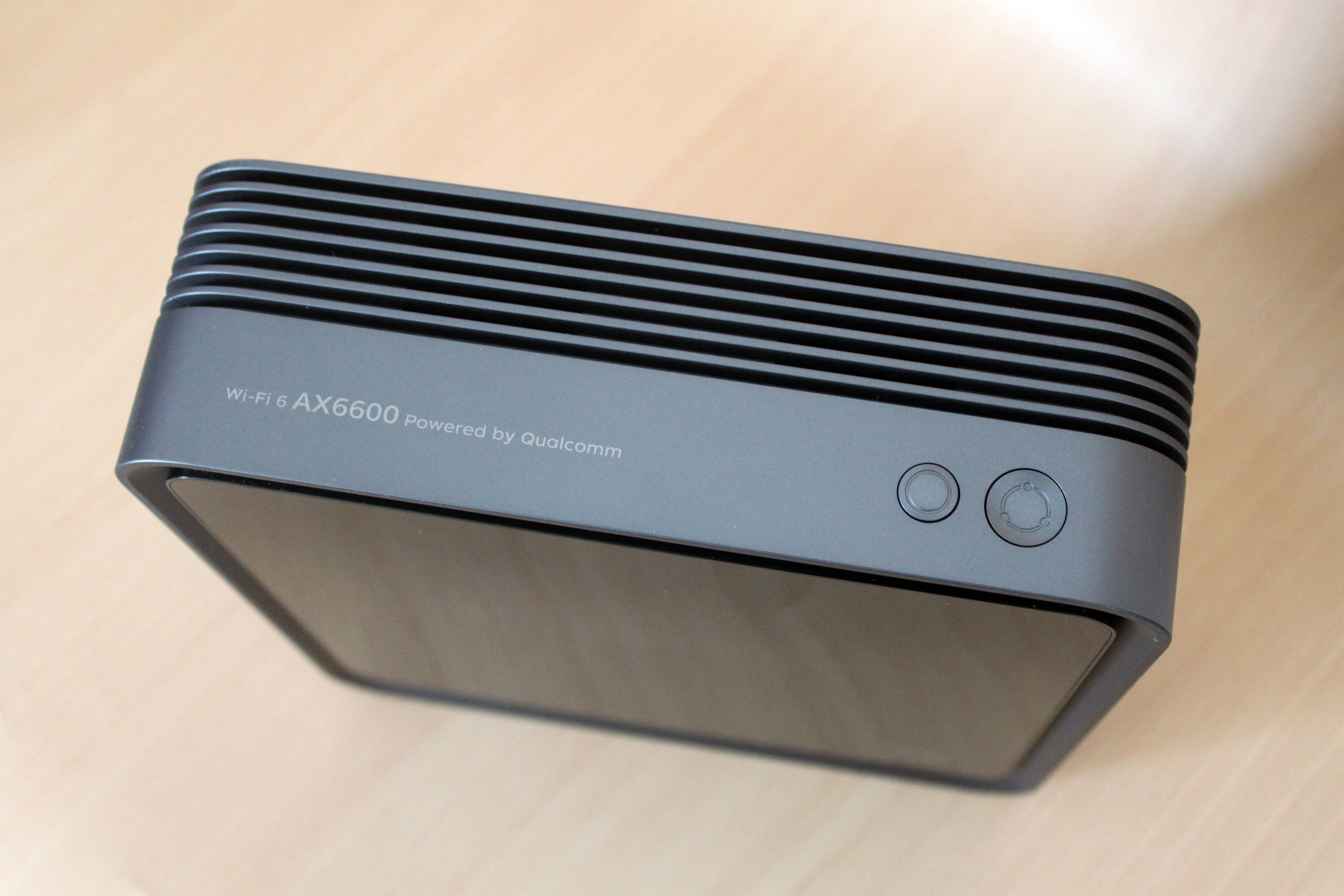 雅典娜这款路由器机身的顶部,可以看到wifi6和骁龙的标识,这款路由器采用了骁龙的处理器,并提供wifi6的网络。在机身顶部,可以看到路由器的开关和重置的实体键,方便对路由器的操作。为了保证这款路由器运行时的散热,路由器设置了很多散热格栅。