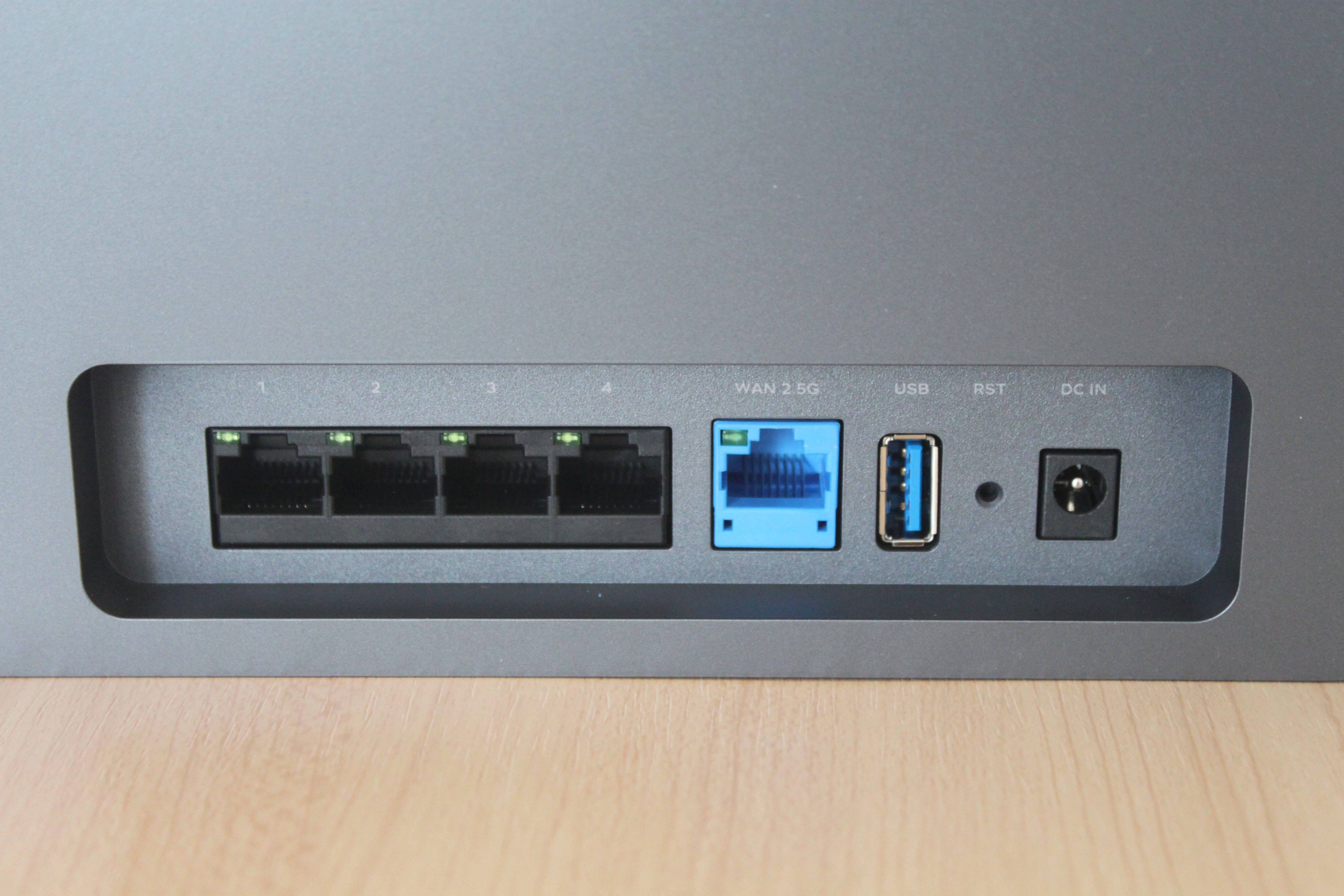 雅典娜这款路由器的背面可以看到品牌的的标识,很有科技感。在背面的底端有接口槽,路由器设计了电源接口、重置孔、USB3.0接口、WAN接口一个和LAN接口四个。