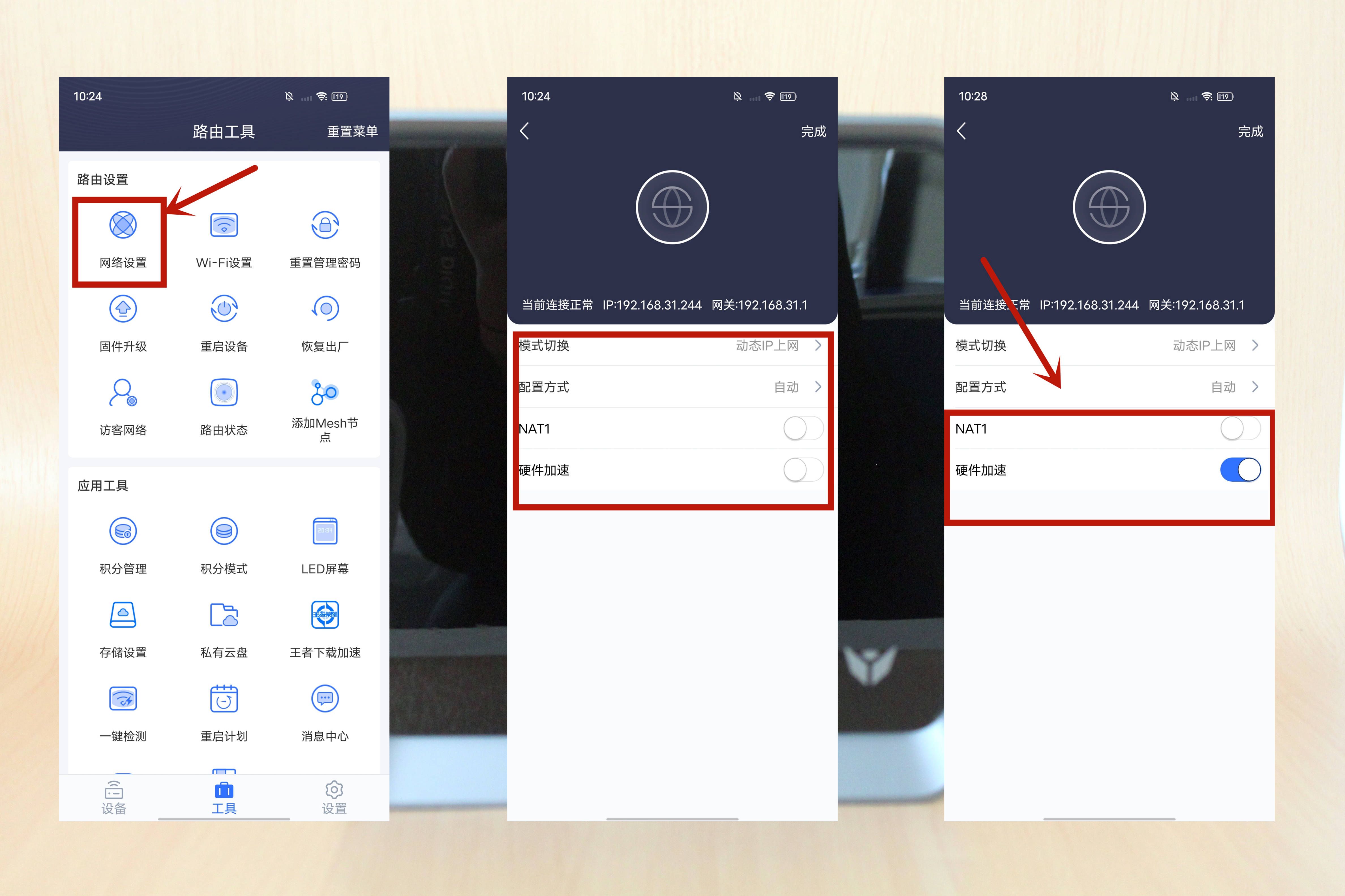 在APP中可以对路由器进行设置,在路由设置栏中,可以对网络进行设置,可以对模式切换、配置方式、NAT1和硬件加速根据网络需要进行设置。