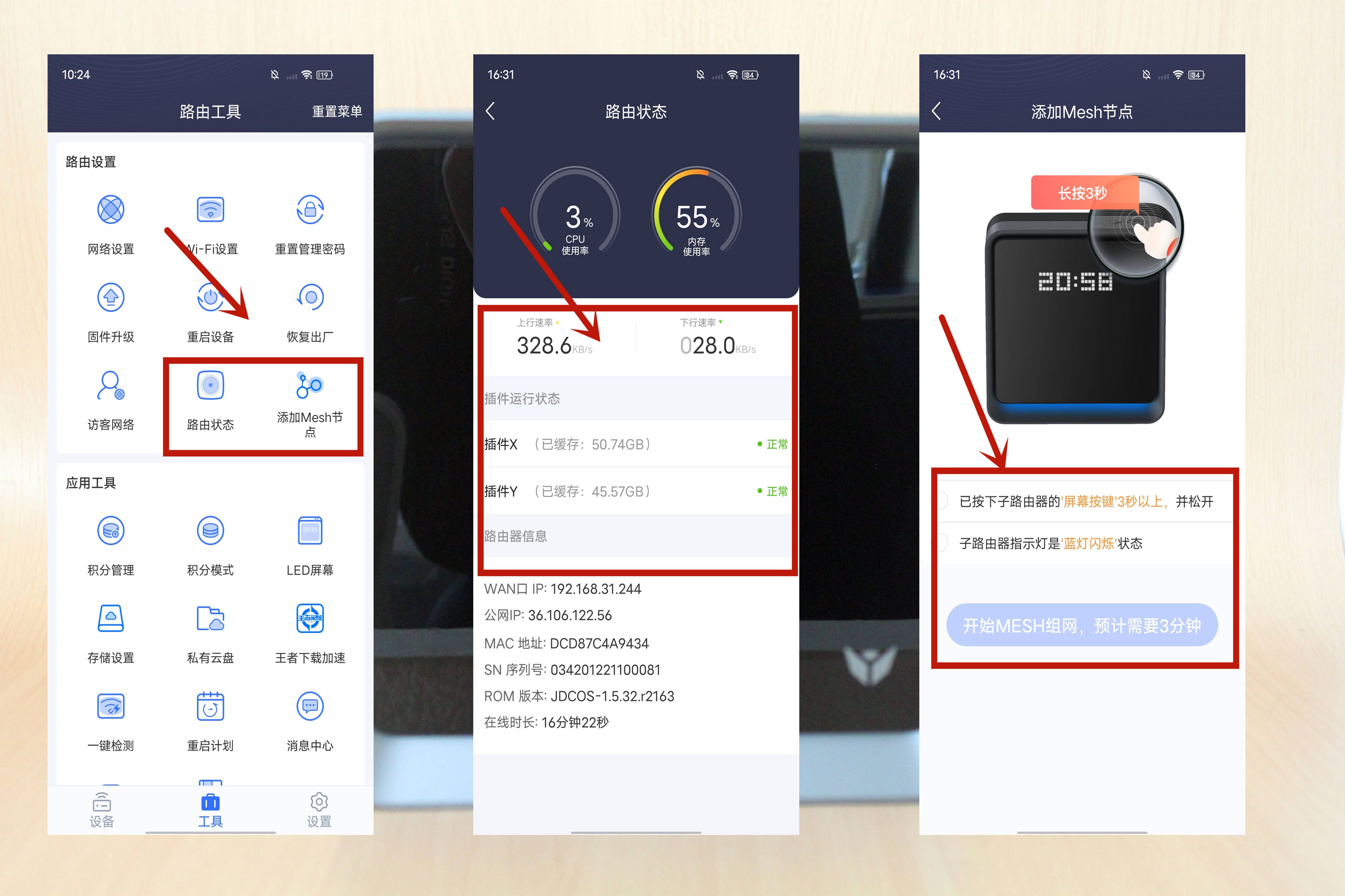 在APP中可以对路由器的状态进行查看,可以查看路由器网速上传和下载情况、路由器插件的运行情况和路由器的缓存情况,雅典娜这款路由器内置了128G的存储内存,很好地利用内存进行缓存。对于大空间的房子来说,这款路由器支持Mesh网络的搭建,根据搭建Mesh的操作指导即可,只需三分钟就可以完成Mesh网的搭建。