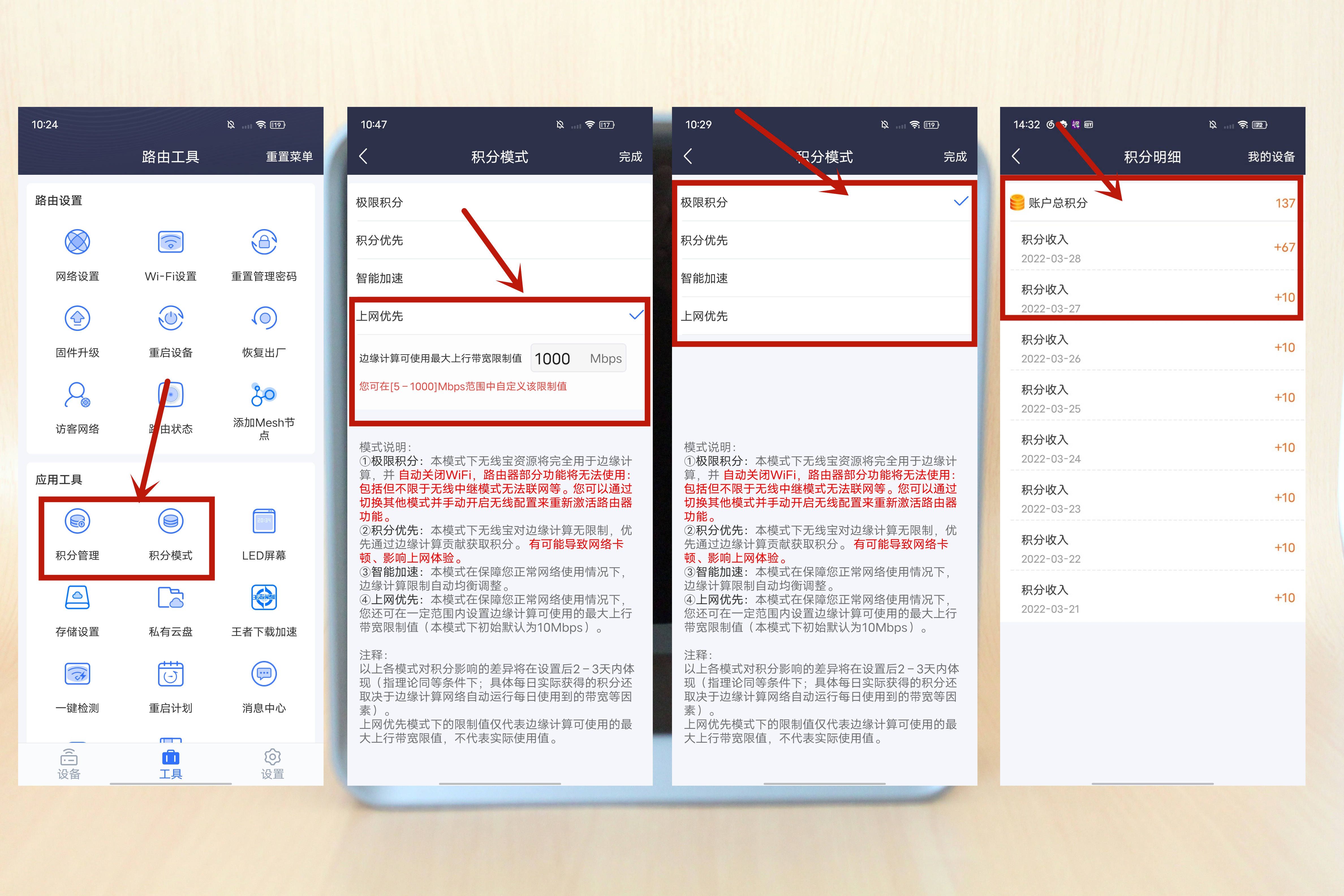 京东无线宝云路由的最大亮点就是可以把闲置的网络进行整理利用,从而获取一定的积分奖励,在APP中的积分模式中可以对路由器的工作模式进行设置,可以选择极限积分、积分优先、智能加速和上网优先模式,在上网优先模式中可以对带宽的限制值进行设置。如果选择极限积分的话,路由器会关闭wifi功能,主要进行积分的赚取,路由器在前七天是调试阶段,每天给固定的10积分,之后会根据家里的带宽和缓存情况等给不同的积分。在积分管理里面,可以查看每天的积分收益和整体的积分收益,积分有效期一年,可以用积分兑换京豆或京东E卡,用于日常的购物消费。