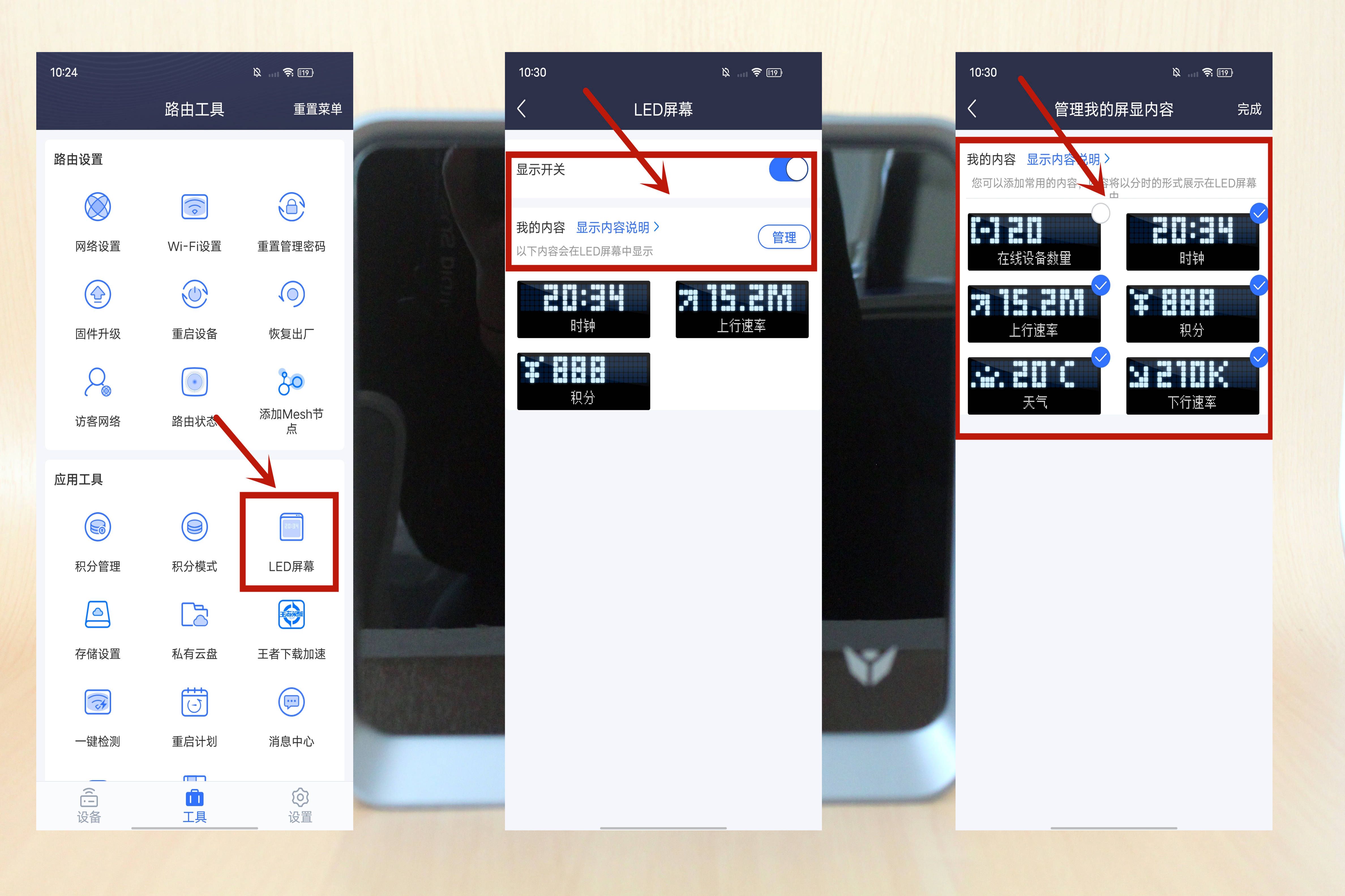 雅典娜这款路由器自带了一块显示屏幕,在APP中可以对屏幕的显示进行设置,可以开启或关闭屏幕显示,也可以对屏幕的显示内容进行选择管理,选择要在屏幕上进行显示的内容,通过屏幕可以更加直观地了解路由器的运行状态。