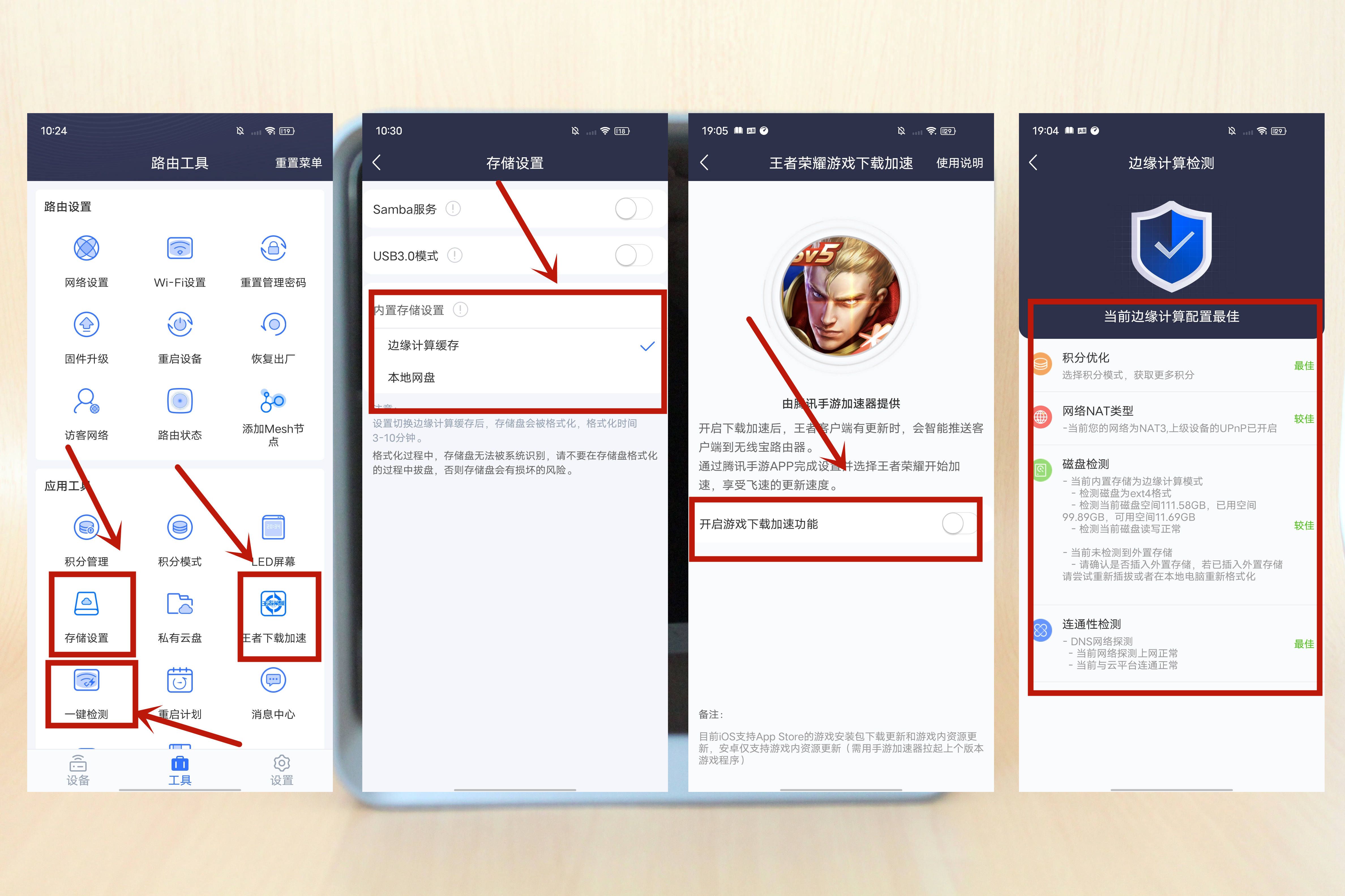 在APP中还有很多小工具,可以对内置存储、游戏加速和系统一键检测等功能进行设置,方便日常路由器的使用。