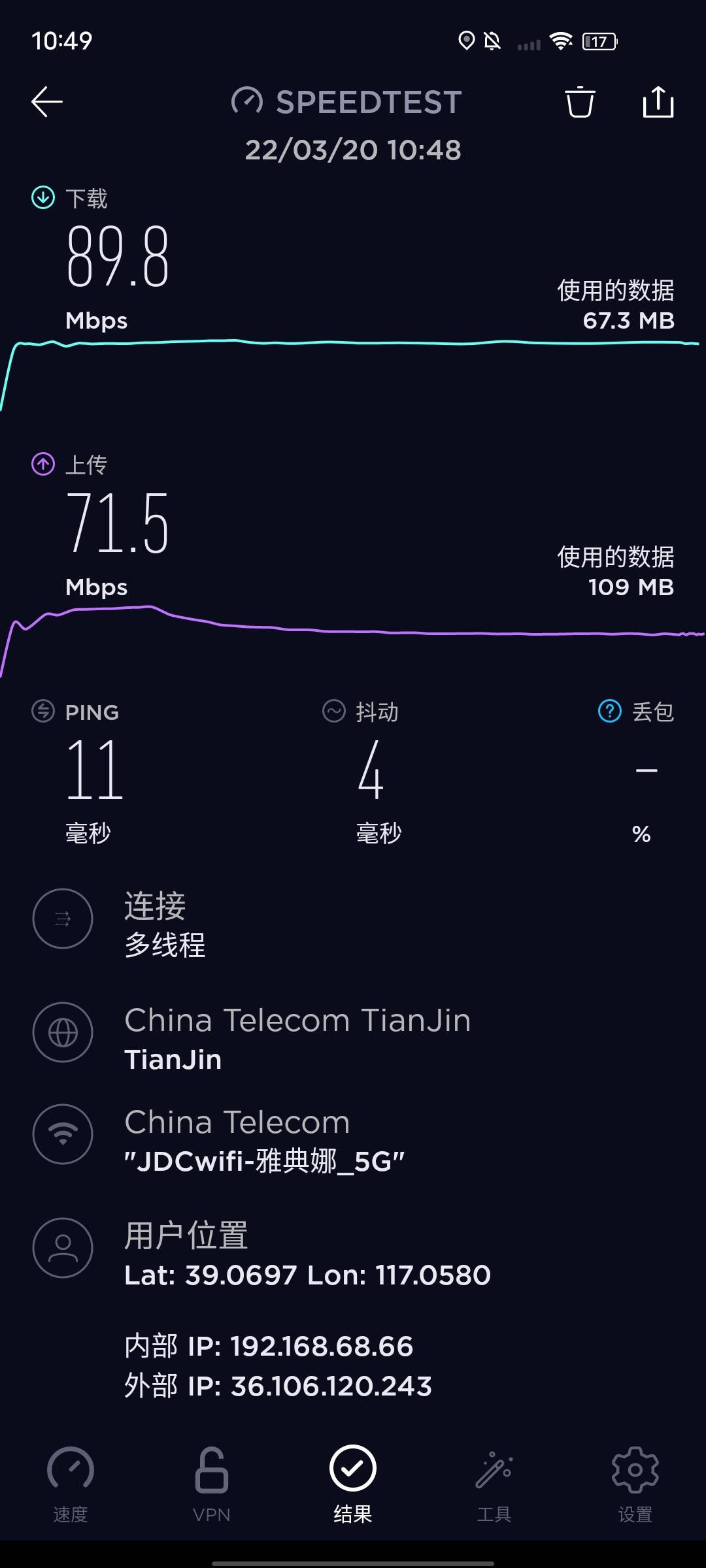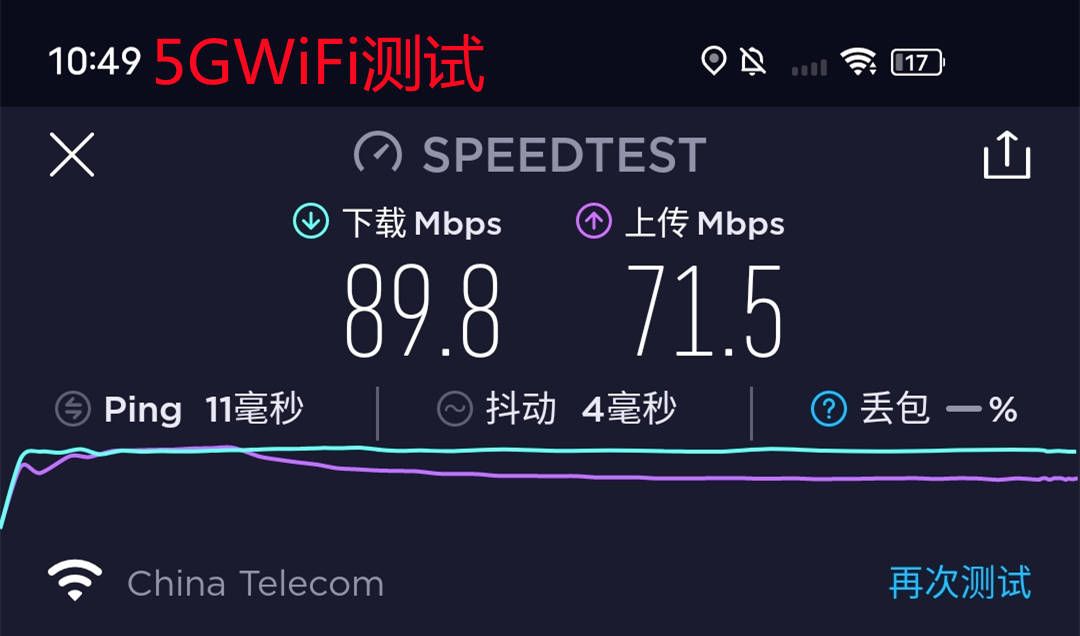 路由器主要是为了在家搭建WiFi上网使用,先用Speedtest第三方测速软件对5GWiFi进行测试,可以看到5GWiFi的下载速度可达到89.8Mbps,上传速度可达到71.5Mbps,网络的Ping值11毫秒,抖动4毫秒,网络整体稳定性不错。