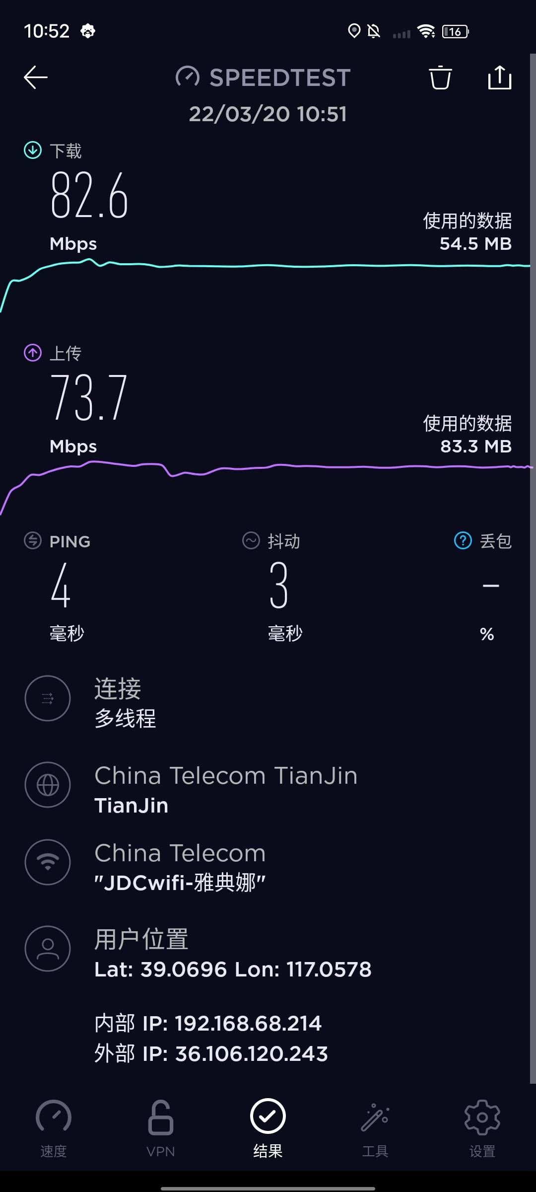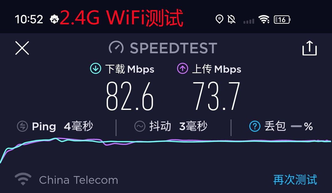 再用先用Speedtest第三方测速软件对2.4GWiFi进行测试,可以看到2.4GWiFi的下载速度可达到82.6Mbps,上传速度可达到73.7Mbps,网络的Ping值4毫秒,抖动3毫秒,网络整体还是很稳定的。