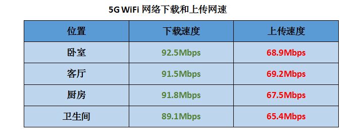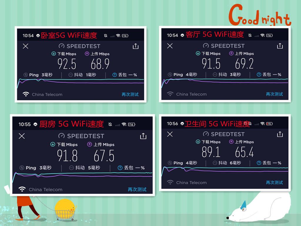 看看京东雅典娜这款路由器的穿墙功能,同样采用Speedtest第三方测速软件,可以看到每个房间5G WiFi网络的上传和下载的速度,可以看到每个房间的网络强度相差无几,信号都比较好,可以看到这款路由器的穿墙功能很强大。