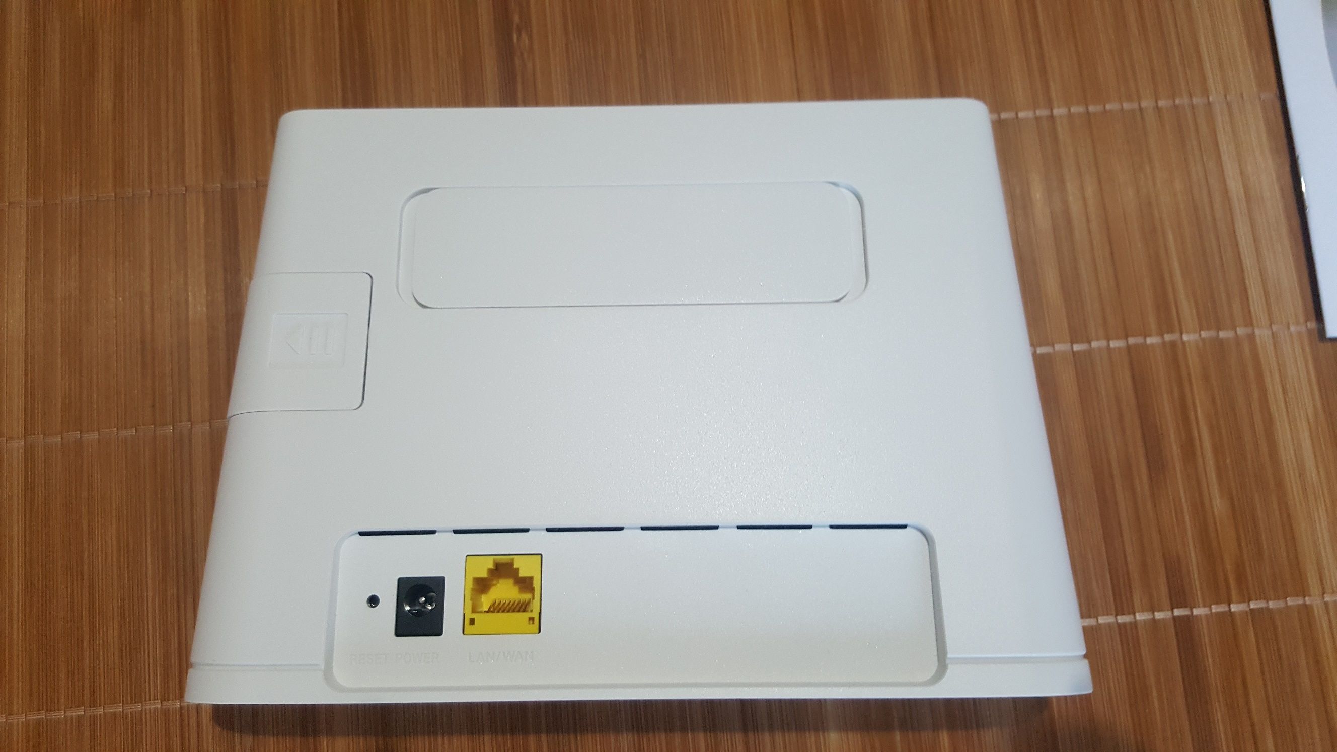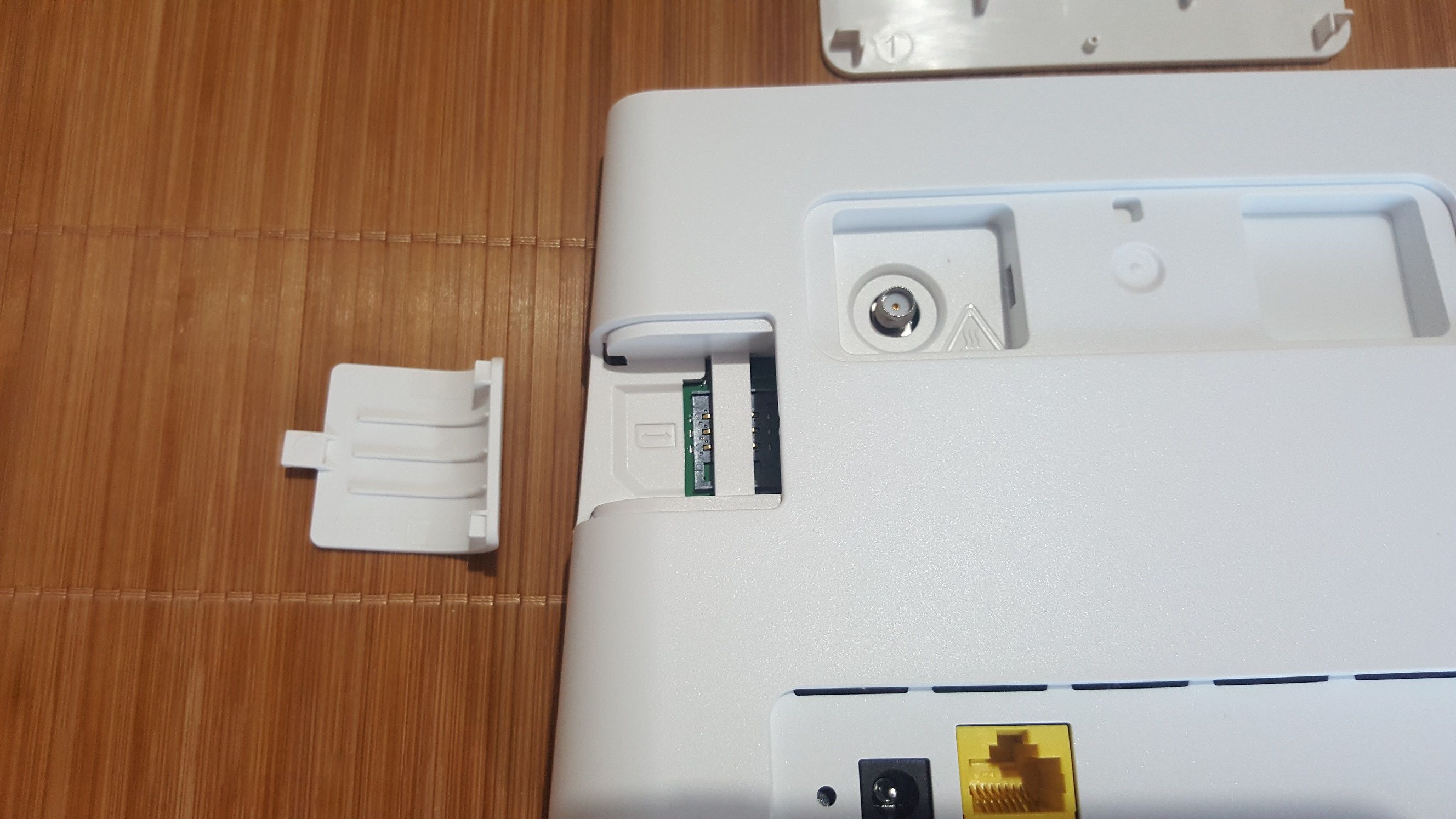 路由器的背面分为三个区域,最下面的凹槽内分别有复位键、电源接口和一个自适应网线接口,还有一条镂空的散热口。左侧的盖板移除后内部是Sim卡槽,使用的是标准的大卡。上部的盖板移除后内部是增益天线接口,如果距离较远信号不佳,可以自己外接增益天线