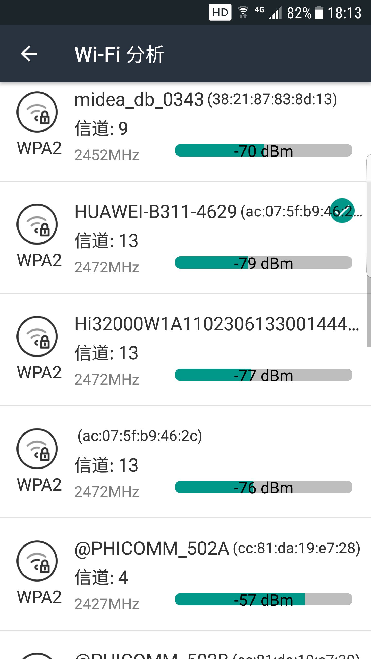 试用中对路由器信号强度也进行了测试,使用手机连接网络,在家中不同地点使用WIFI分析APP对信号进行分析。测试结果如下:当处于同一房间内,信号强度为-59dBm;处于间隔一堵墙的隔壁房间内,信号强度为-67dBm;处于间隔两堵墙的客厅内,信号强为-79dBm。图中为间隔两堵墙的测试情况,HUAWEI-B311为测试路由器名称。按照中国移动的信号规范规定,接收电平>=(城市取-90dBm;乡村取-94dBm)时,则满足覆盖要求,说明此处无线信号强度满足覆盖要求。也就是说基本属于全屋覆盖。