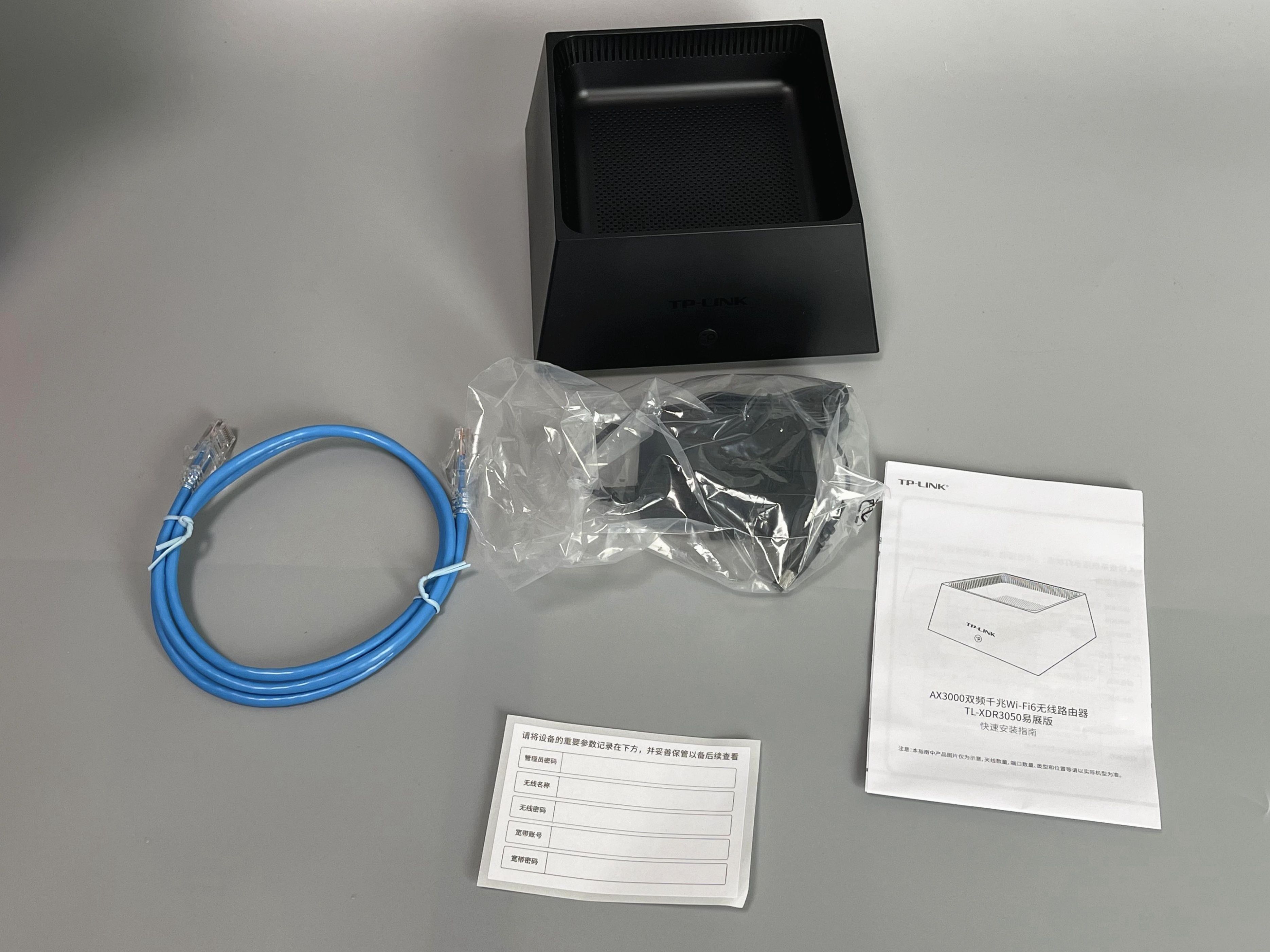 包装内,有一个路由器主体,一个电源,一本说明书,一个记录表(可以把上网的ssid和密码都写在这个表上,再贴到路由器上。)还有一条网线,看数据TL-C5E0-1,属于超五类,支持千兆网络,如果内网要万兆,你只能上六类以上,起码这次的主题是普通家庭,千兆就足够了。