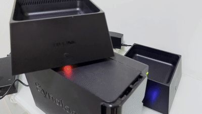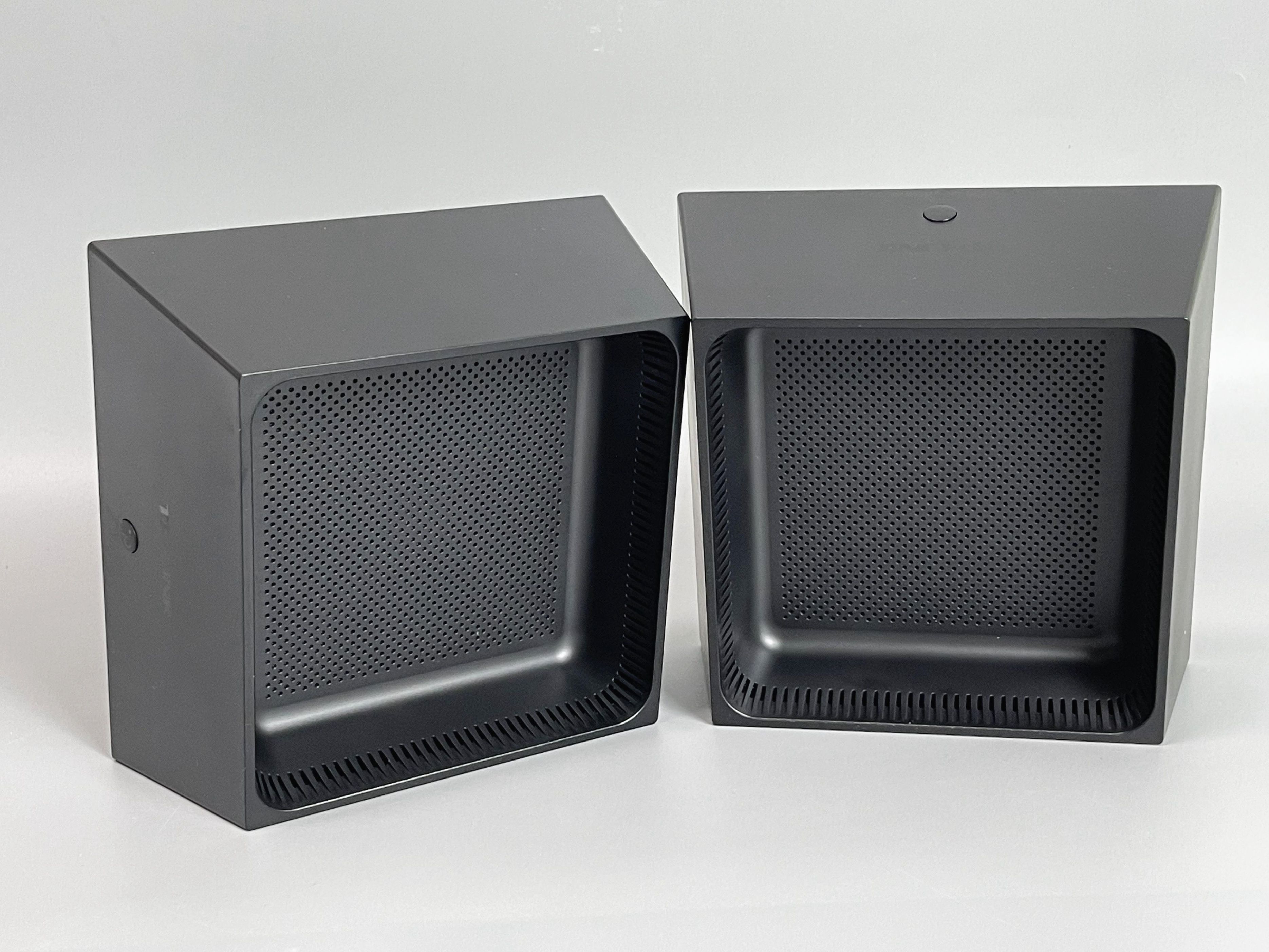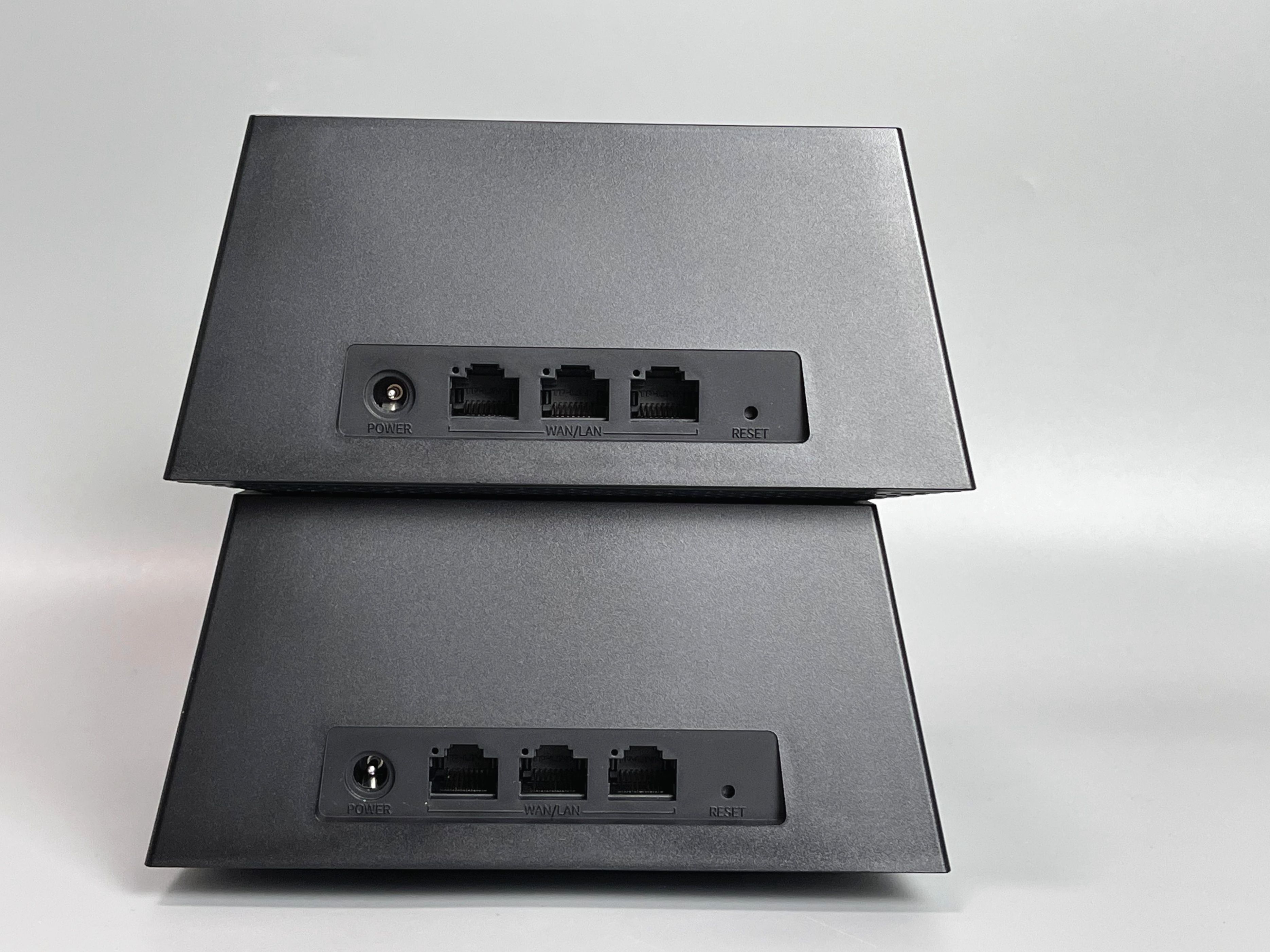 样子就方方正正一个梯形体。正面有一个带易展logo的按钮(用于自动配对),顶部有网格散热,但如果正放,可能半年左右就积尘了,后面是三个网线接口,支持乱插,不分lan/wan口,对小白很友好。