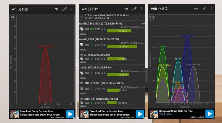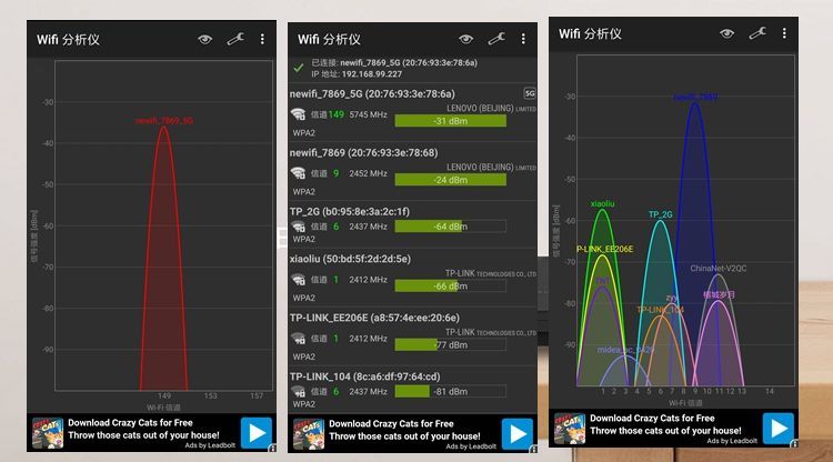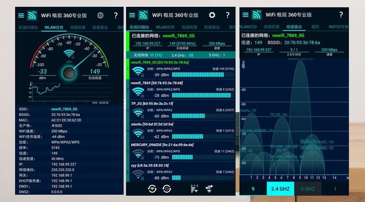 测试用软件:WiFi概观360Pro/inssider_cn/wifi分析仪