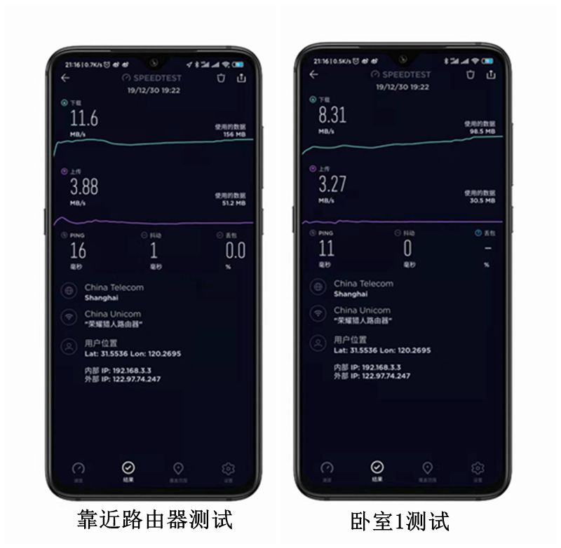 荣耀猎人游戏路由器搭载了华为自研凌霄四核1.4GHz CPU和凌霄真三频WiFi芯片,配备了256MB大内存;机器内置有6颗独立信号放大器,信号更强、覆盖更广。路由器提供三频道,其中2.4GHz与5.2GHz频道二合一自动切换,5.8GHz单独分出来作为游戏频道,可以最大限度的抵抗WiFi信号的干扰,每一个Wi-Fi频道都采用了双天线设计,实现了“双发双收”功能。为此,小新也进行了测试,家使用的是联通100M宽带,靠近路由器测试实际最大速度,最大下载速率为11.6MB/s,在靠近路由器最近的卧室测试下载速率为8.31MB/s,看高清电影也没有卡顿现象。