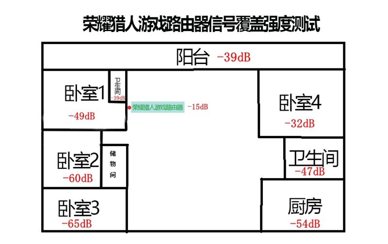 接着,小新又测试了各个房间的信息强度,在所有测试点位中,卧室4位置的信号最强,可见荣耀路由器单面墙的穿透能力很强;卧室3位置则相对要弱很多,毕竟该位置路由器Wi-Fi覆盖需穿过的墙层数也最多,即便如此信号也仍有-65dB,延迟保持的也不错,这也证实了荣耀这款猎人游戏路由的信号强度是十分的优秀,可以轻松120平米左右的房屋。