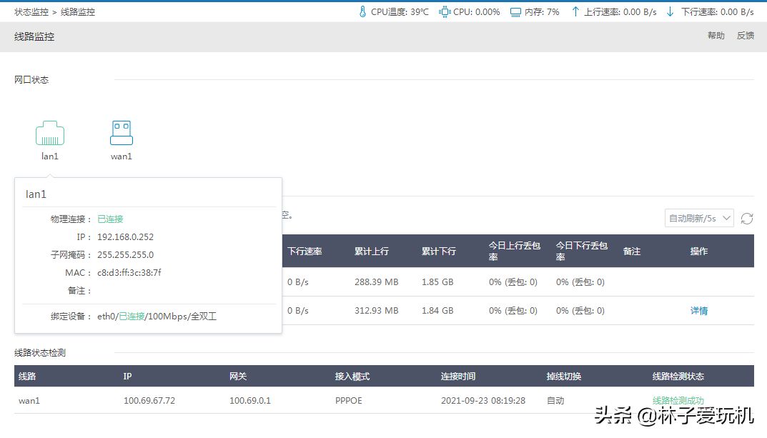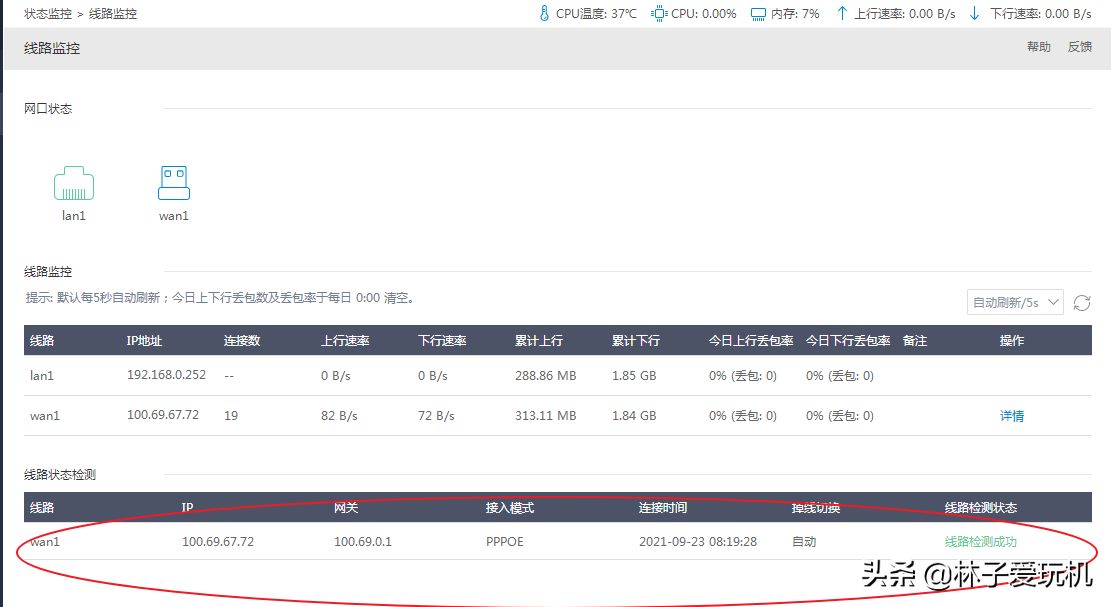 在线路状态检测内容中,包好了获取到上级网络的信息情况。根据状态的显示