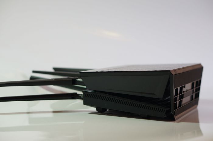 ▲侧面对比,可以看出1900p要厚不少。另外由于66u是卧式设计,所以侧面也设计了散热孔,但1900p是立式设计,所以散热孔都放背面了。