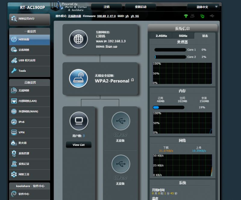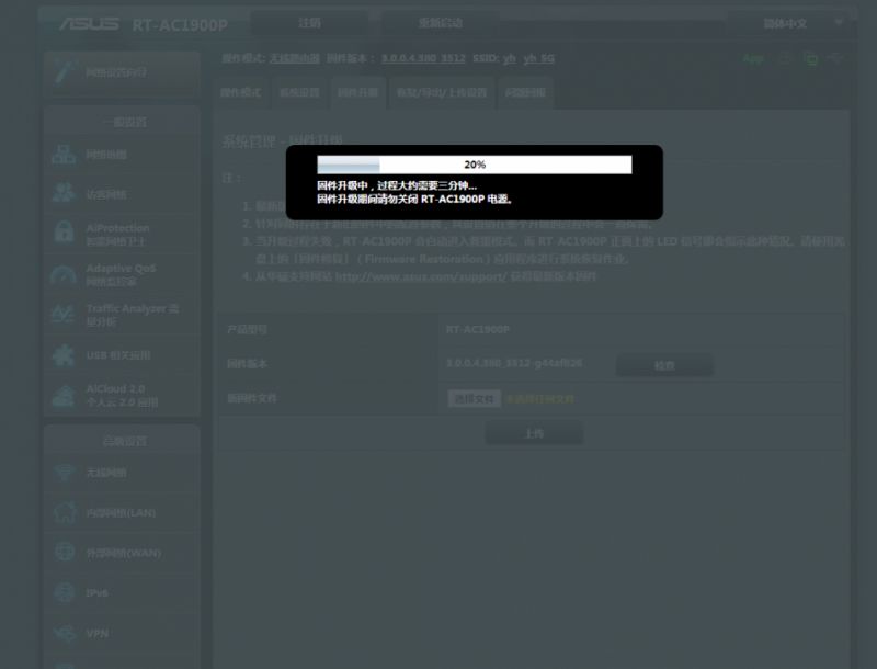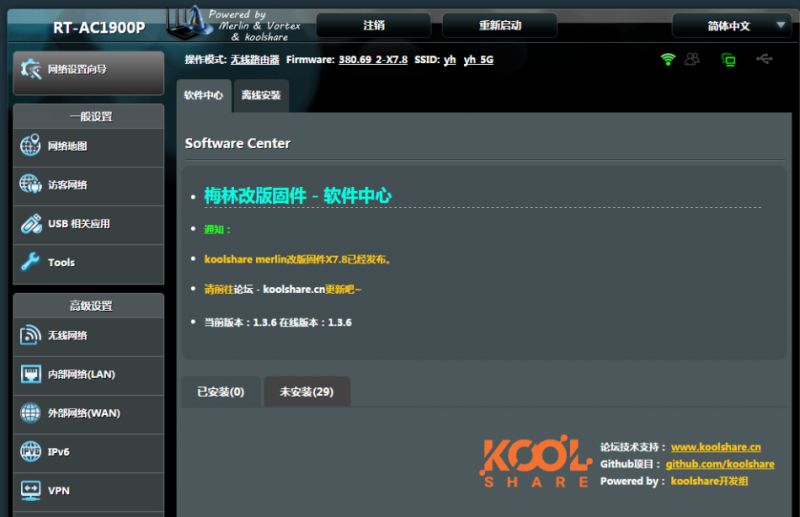 ▲当然需要升级改版固件,不然就不需要升级路由器了。我用的是koolshare的改版固件,直接下载到电脑然后路由器登录界面,系统管理-固件升级,上传固件进行升级。升级后的固件界面和华硕基本一模一样,不过多了几个功能。左上角多了个魔法师帽子图标,表明这是个改版梅林固件。另外升级后,发现aimesh node没了,估计是目前的估计版本不支持aimesh,等后续看看能否支持。升级后,左下角多了个至关重要的软件中心,右下角可以显示开机时间、温度、处理器负载等信息。