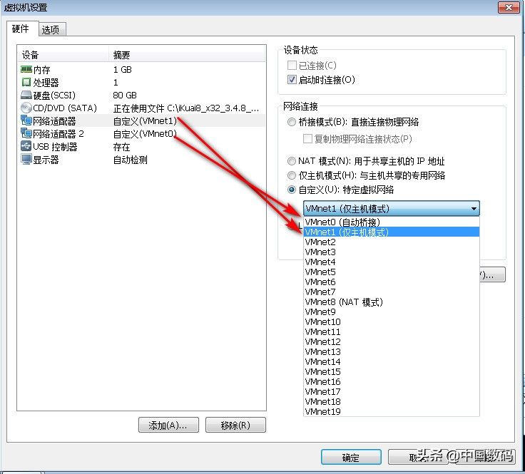 安装完成后不要启动,点击编辑虚拟机系统。因为路由器需要有至少两个网卡,一个WAN口,一个LAN口,因此需要再添加一个虚拟网卡。路由系统默认第一个网卡绑定LAN口,这样第二个虚拟网卡就是WAN口了。添加并设置两个虚拟网卡选项如下图所示。