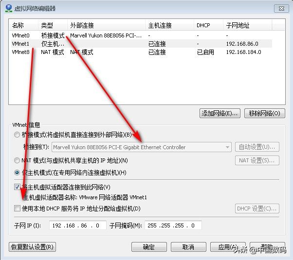 虚拟机添加了两个虚拟网卡后还有进行设置,方法如下,点击虚拟机软件菜单--编辑,点击下拉菜单中的虚拟网络编辑器,在弹出窗口按下图设置。VMnet0设置桥接模式,这个是WAN口网卡,桥接到电脑物理网卡。VMnet1是LAN口网卡,我这里设置仅主机模式,用来通过电脑浏览器管理路由器,取消下面的DHCP服务器,后续手动设置IP。