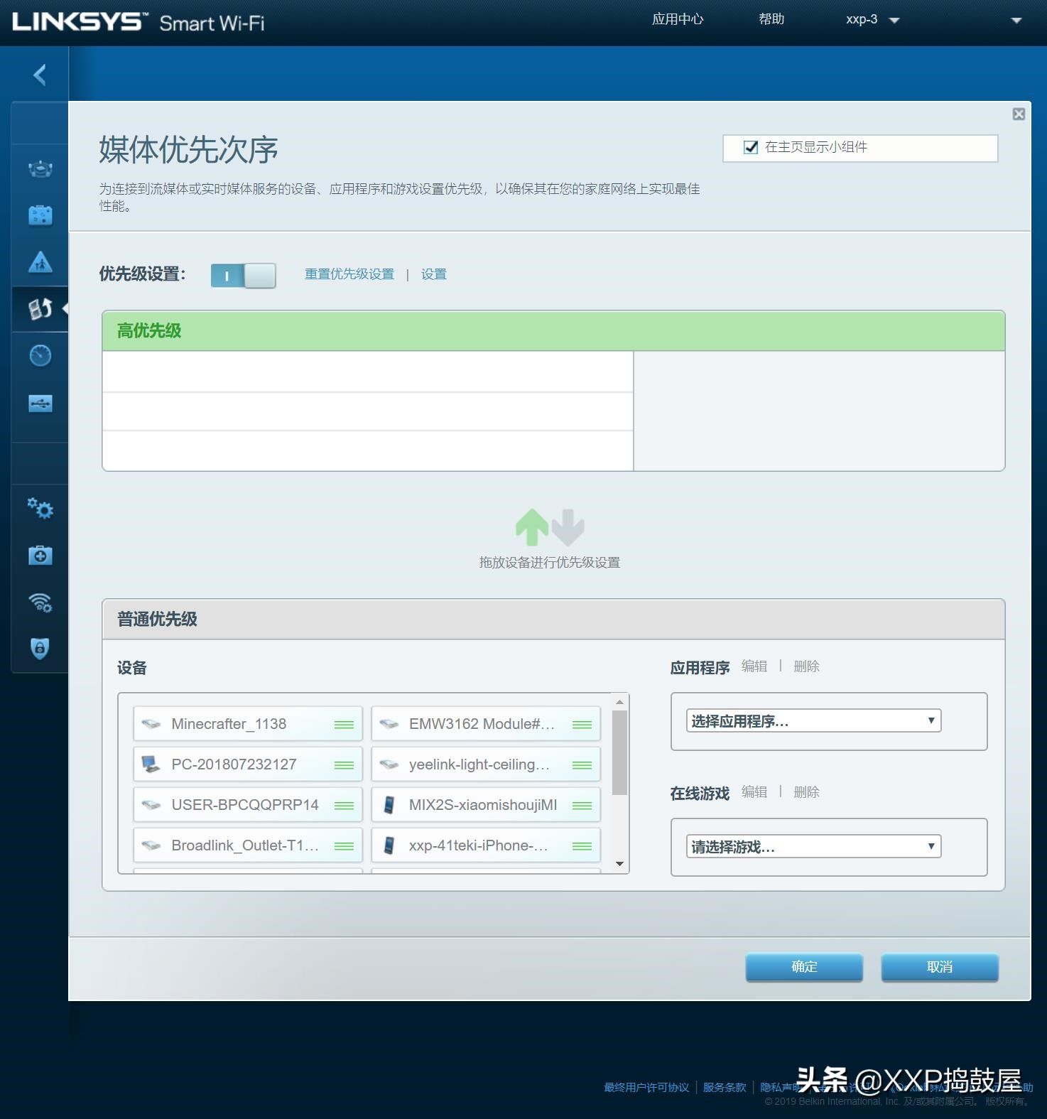 媒体优先次序,对于现代家庭来说几乎用到的电子设备都是需要搭建在网络的基础上,而媒体优先次序必然是重要的,可以给多设备或者是应用软件、游戏进行排序优先度,这样就可以让网速分配达到某设备或者应用软件、游戏的最佳联网体验。例如爸妈他们经常会手机看电视看剧的,我会把他们手机设为高优先级,这样他们看视频的话就不用担心会突然网速卡顿不流畅了。