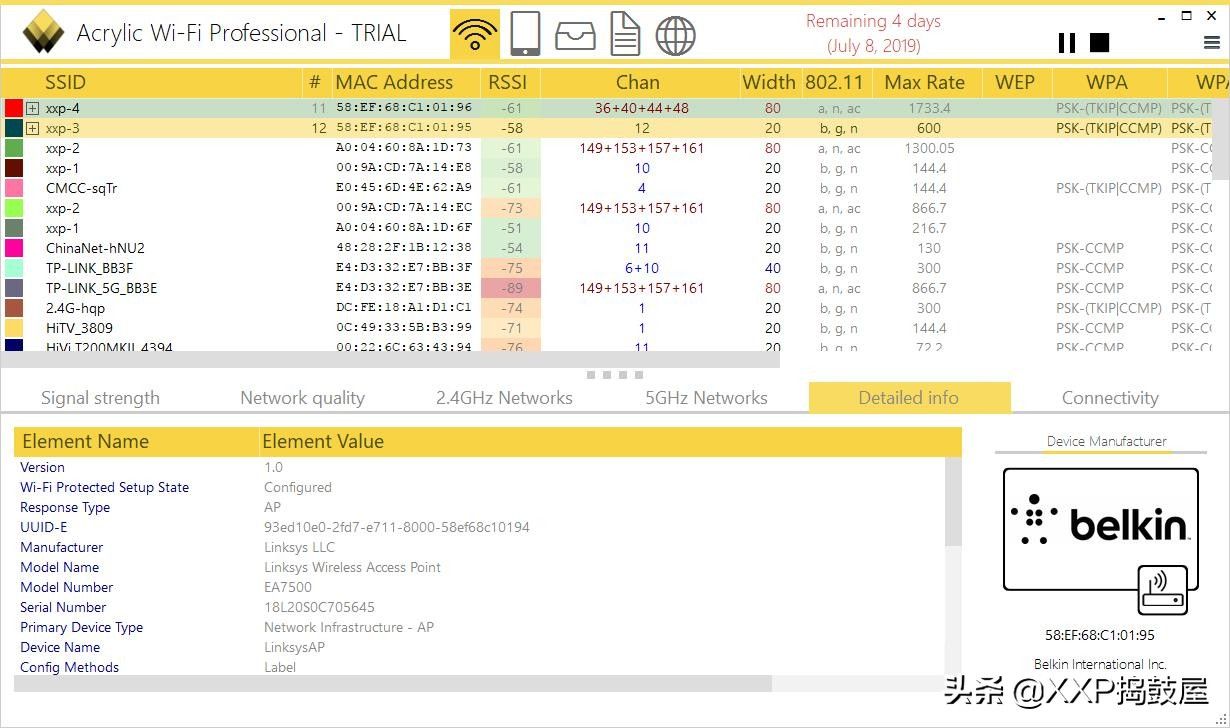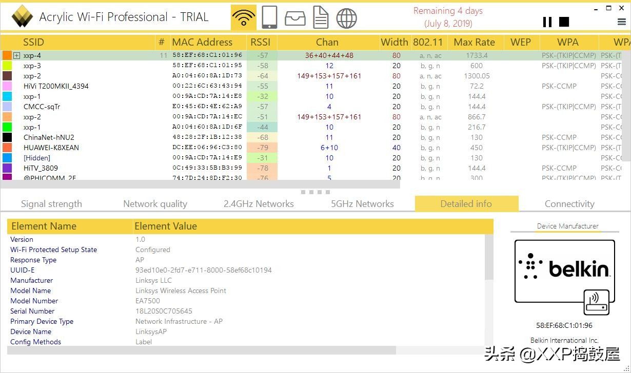 ▲使用Acrylic WiFi Professional分析软件,针对SSID:xxp-3(2.4GHz)和xxp-4(5GHz),包含:信道选择是否优良、信号强度、信噪比、网络安全性、传输速度以及传输标准,可以说是一个很直观的综合分析信息。在此位置xxp-3(2.4GHz)和xxp-4(5GHz)的信号强度分别为:-40和-48。