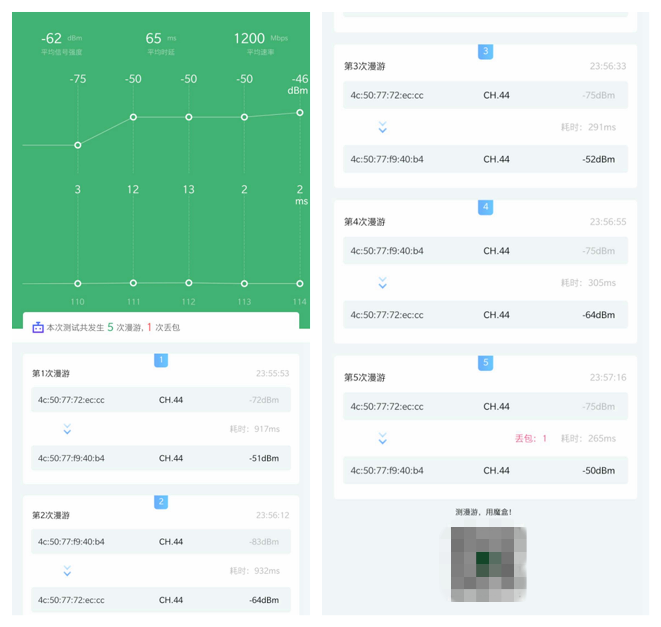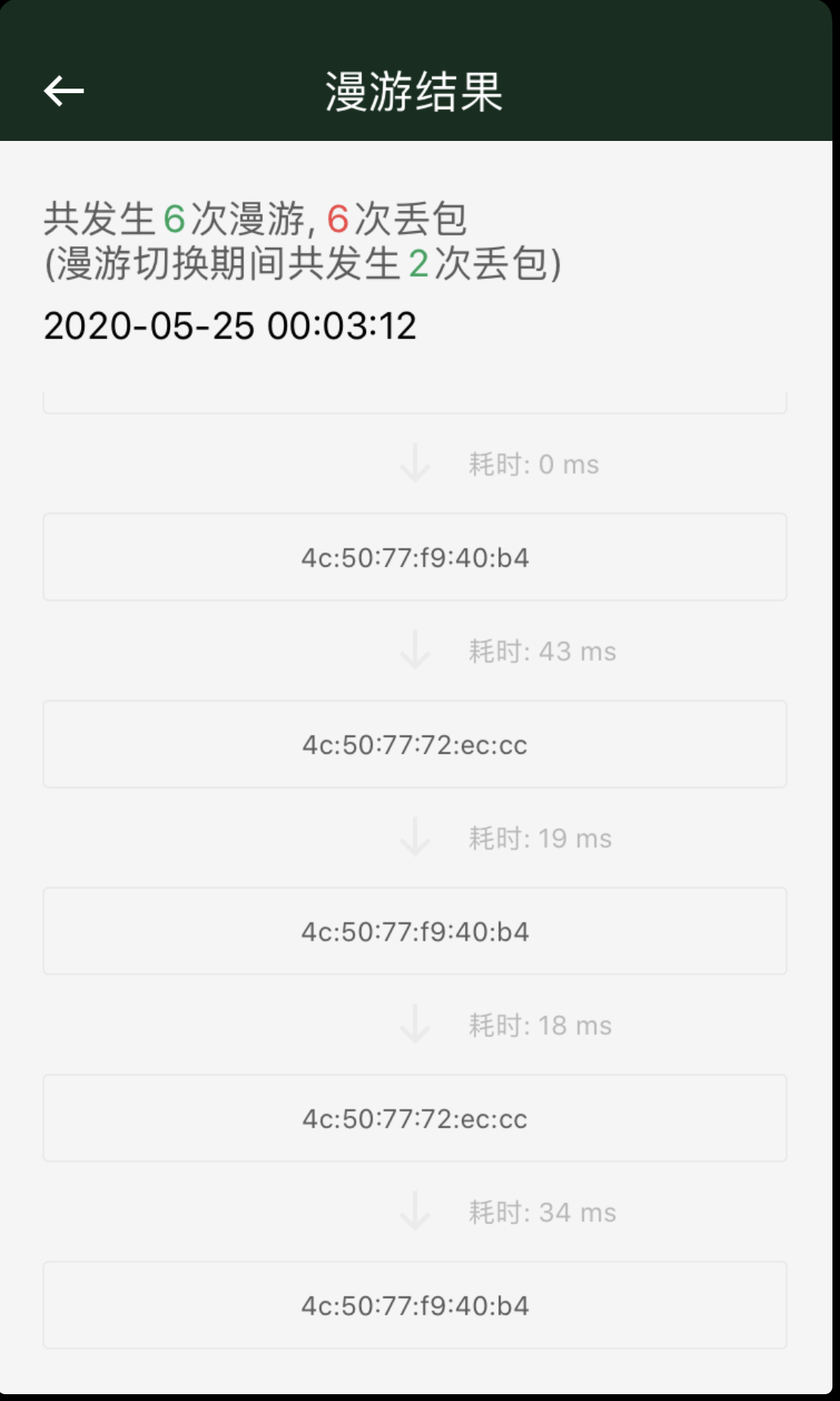 ▼组网成功后,关键还是要看一下漫游的体验,下面进行了漫游的测试。首先是不支持快速漫游协议的安卓移动设备的漫游情况。通过测试,安卓下可以实现漫游,但不算太理想,最高的漫游时间已经接近1s左右了,另外漫游时信号的临界值为-75dBm左右,会造成一定的丢包。
