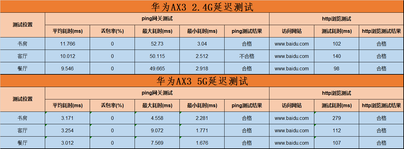 ▼下面是华为AX3分别在2.4G及5G信号下的延迟表现数据。在可连接区域的延迟表现差异不算很大,2.4G平均延迟在10ms左右,5G信号的平均延迟在3ms左右。在可连接区域的网页访问速度表现也都不错,2.4G信号访问速度在100ms左右,不过由于5G信号缺少功放的原因,5G信号强度不好,在间隔一面实体墙后的网页访问速度上升到了279ms。