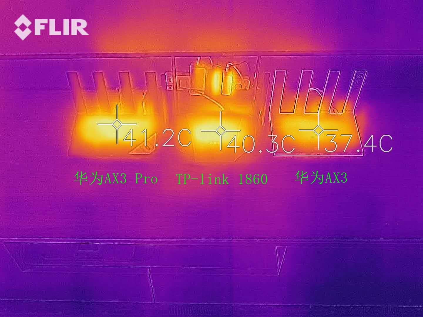 ▼首先是正面温度:环境温度为25摄氏度。可以看到在正面温度表现上华为AX3Pro和Tp-link 1860的表现差距不大,都是在41摄氏度左右,华为AX3的温度最低是37.4摄氏度。