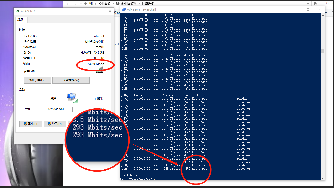 ▼使用intel AX200连接华为AX3进行吞吐量测试,得出了如下的数据。一面实体墙遮挡1.5M处测试wifi6 5G吞吐量,速度是293Mb/s。
