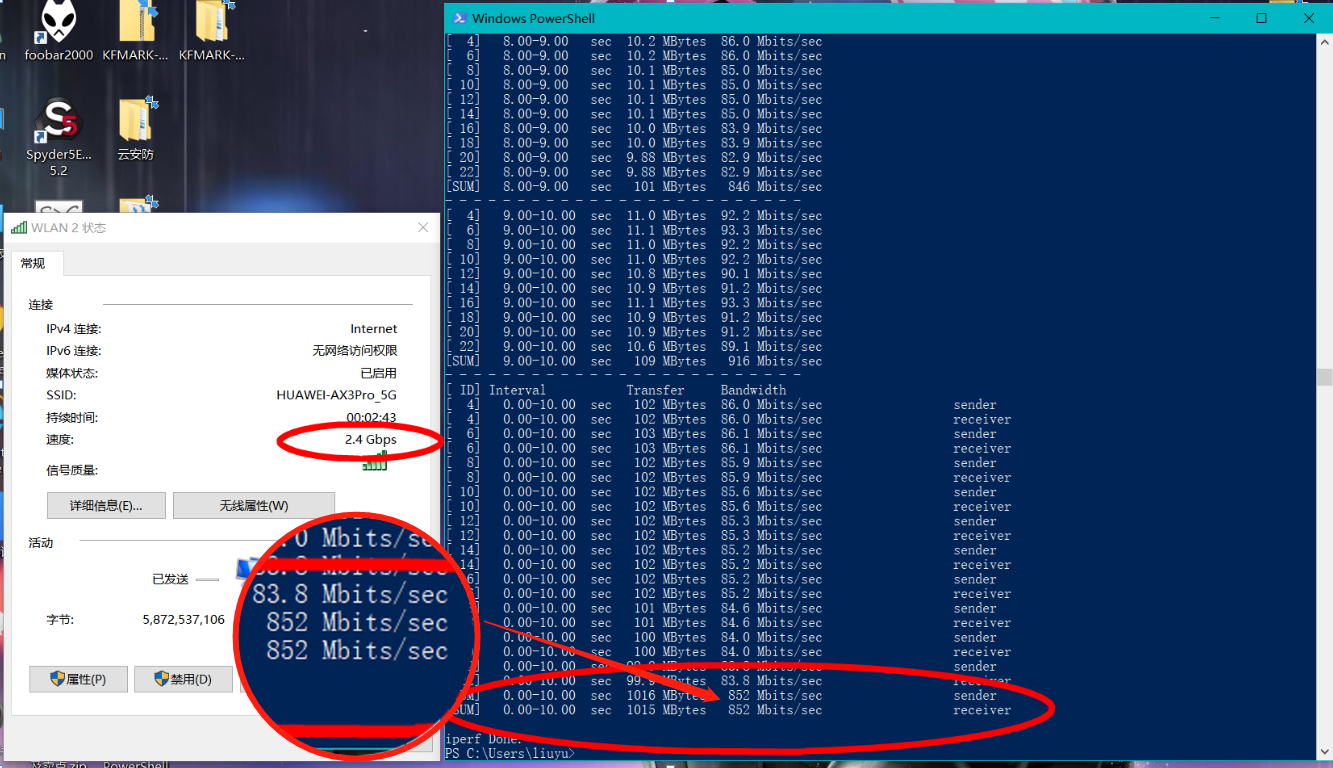 ▼在相同条件下,使用intel AX200连接华为AX3 Pro进行吞吐量测试,wifi6 5G的吞吐速度是852Mb/s。