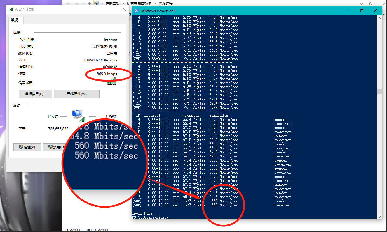 ▼在相同条件下,使用intel AX200连接华为AX3 Pro进行吞吐量测试,wifi6 5G的吞吐速度是560Mb/s。