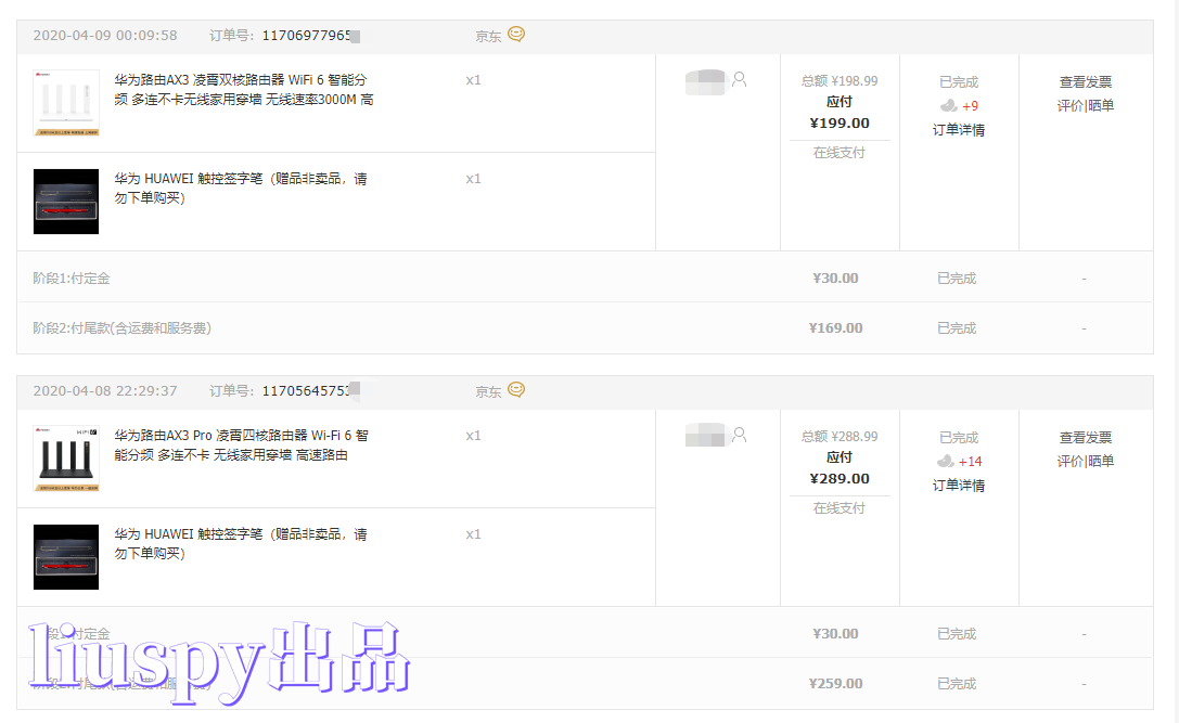 这次4月份发售的3款wifi6产品,售价都不高,不断刷出了新低。我早早在预售阶段就下单订购了,预售价段售价真心不错:华为AX3只要199元、华为AX3 Pro只要289元、Tp-link TL-XDR1860只要266元。
