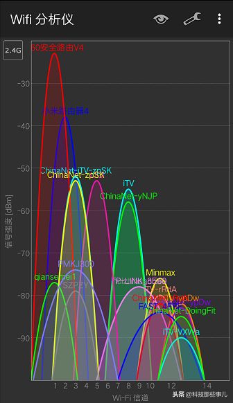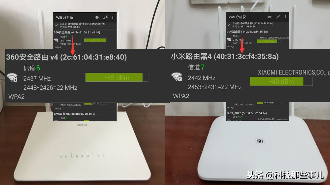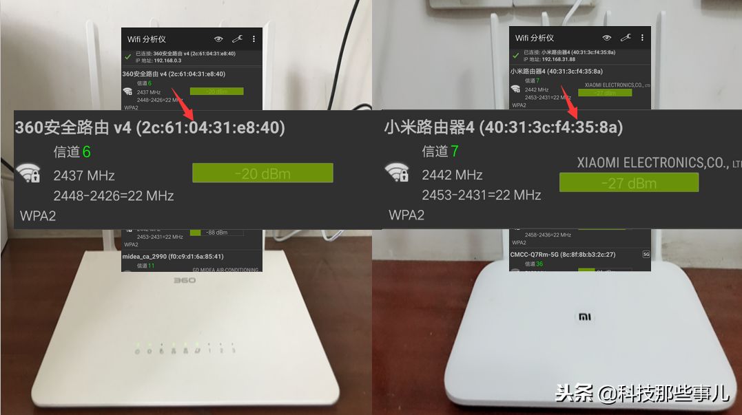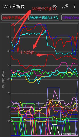 观察下同一点的无线信号强度,可以发现360安全路由器V4的信号强度要 大于小米路由器4的。