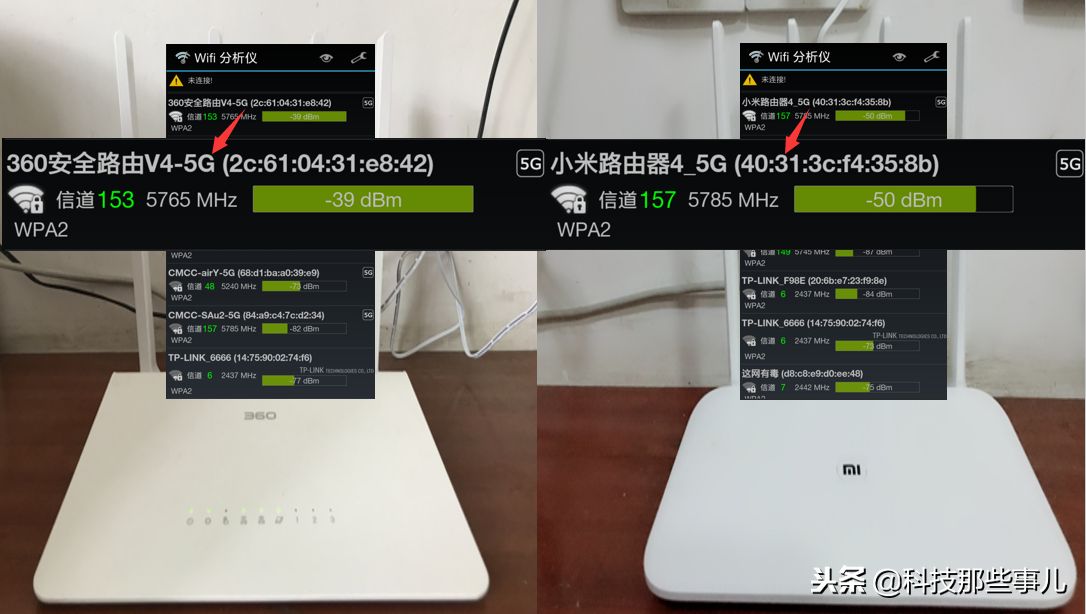 最后看下近距离的比较,这个时候距离近,无线信号强度比较高,那么,2个不同的无线频段下,360安全路由器V4的无线信号强度,依旧是强于小米路由4的。