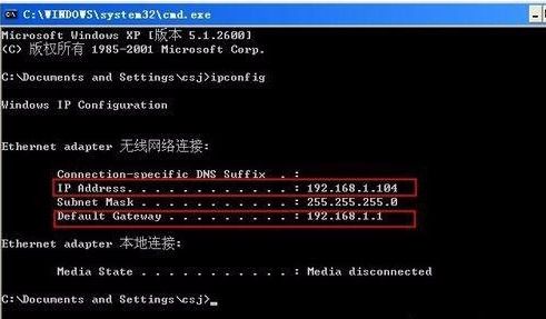 3、显示一段信息,其中ip address就是本机的IP地址,default gateway网关就是我们要查询的路由器地址。