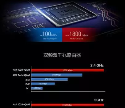 千兆路由器是双频网络,即2.4G频段和5G频段的WiFi,2.4G频段的300Mbps速率加上5G频段的867Mbps的速率合起来为1167Mbps。而普通百兆路由器大多只支持2.4G一个频段的WiFi,无线速率最大450Mbps,故千兆路由器的无线速率要比百兆路由器高。