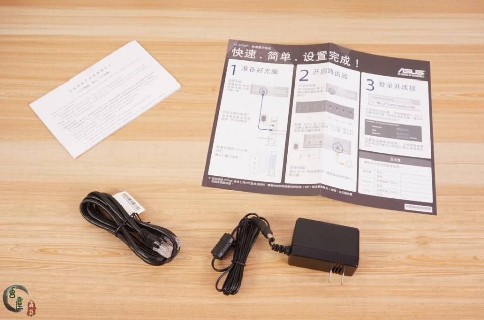 包装盒背面是对产品的特色介绍,都是比较实用的功能。路由器本体及其附件展示,的说明书与保修卡,其它附件分别是电源适配器与网线了。
