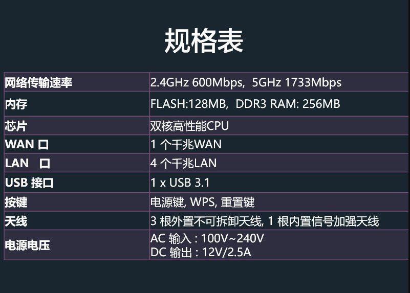 华硕手游路由RT-AC85P的规格表,产品采用了1.8GHz高性能双核处理器,支持802.11ac无线规格,2.4GHz传输速率为600Mbps,5GHz传输率为1733Mbps,AC双频并发速率高达2333Mbps,可以轻松应对多路数据传输,很适合和小伙伴们多人一起开黑。