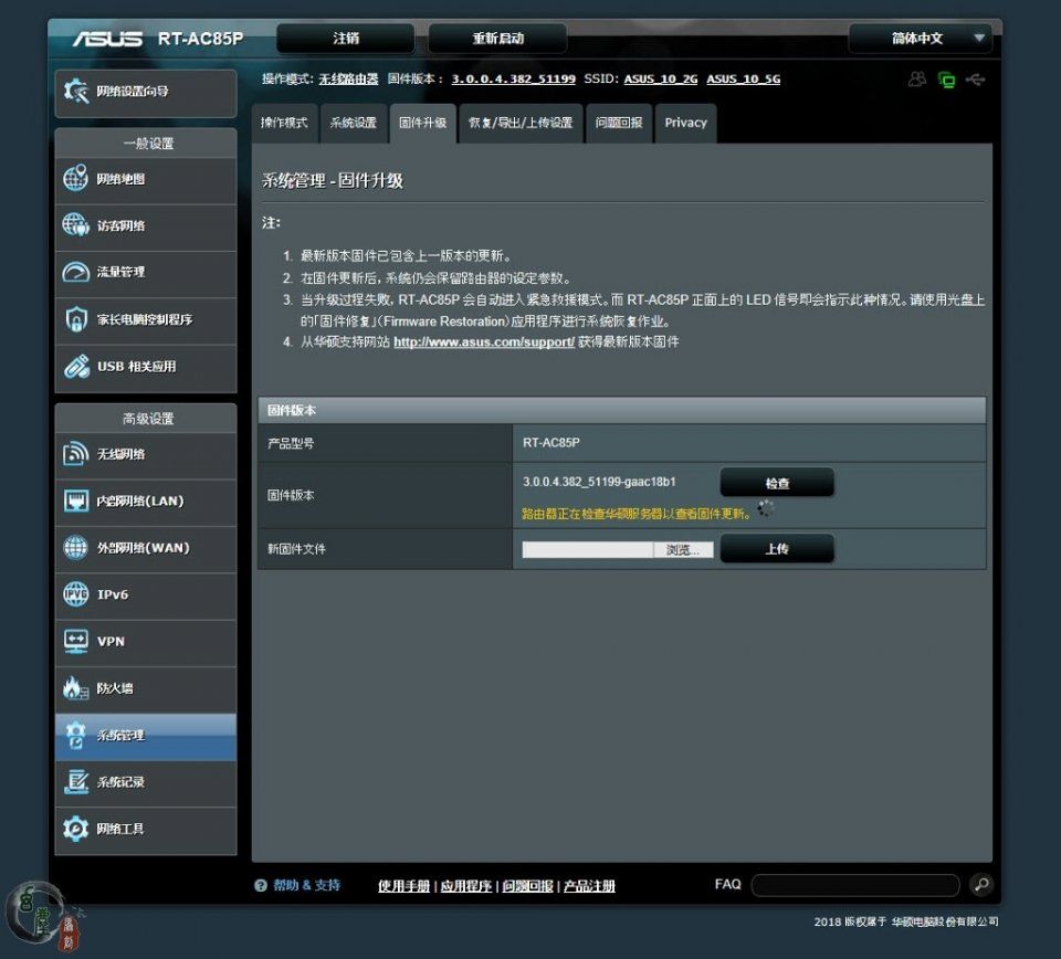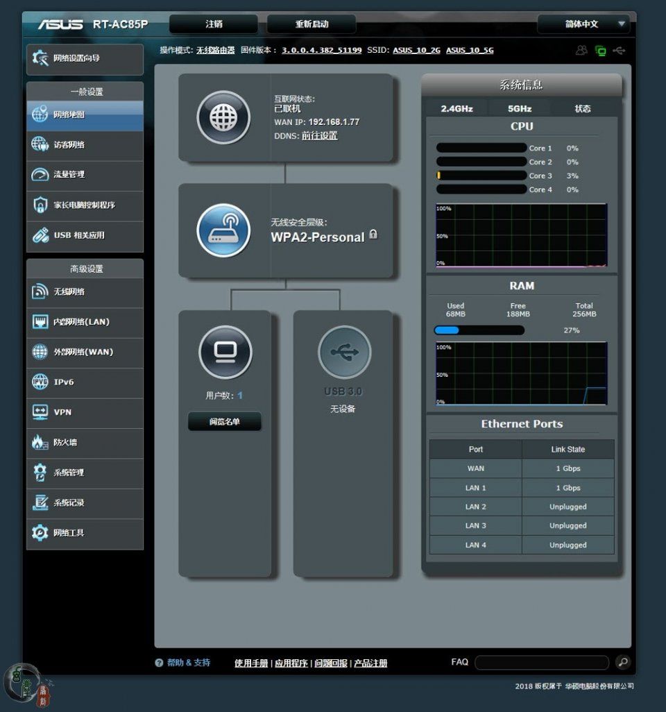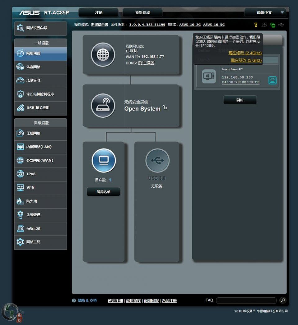 设置完成后的后台展示,虽然华硕手游路由RT-AC85P属于华硕网络旗下的中端产品,但是与普通路由器相比,依旧让我感觉到很高端。
