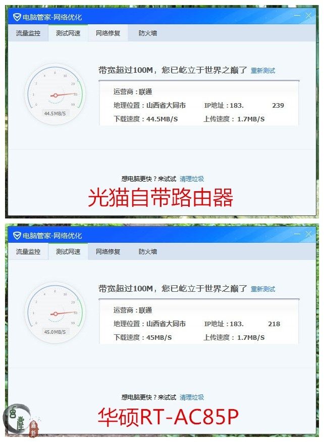 华硕手游路由RT-AC85P 2.4G无线模式下的速度,明显比联通光猫自带路由器速度要快。