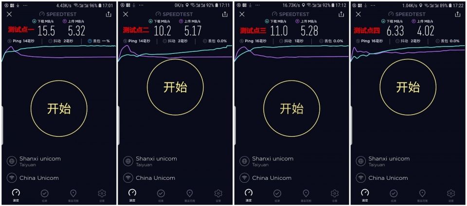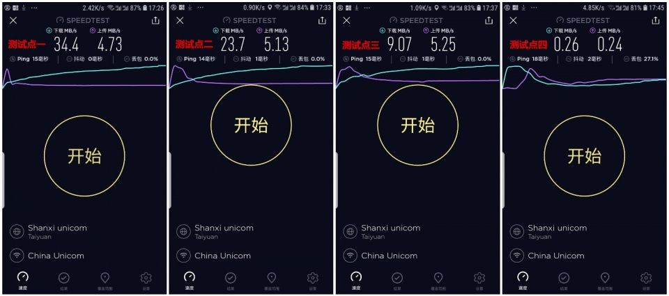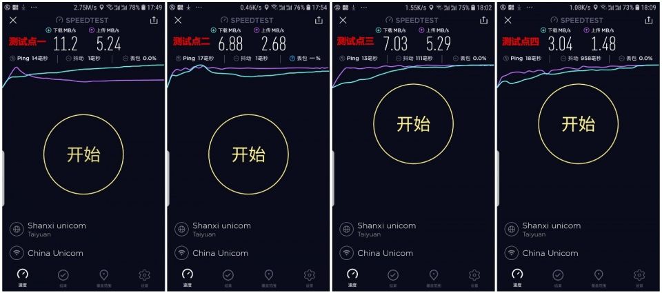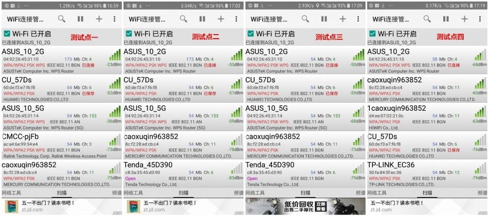 来看一下无线WiFi的信号强度,前面带ASUS字样的,是华硕手游路由RT-AC85P的WiFi信号。带CU字样的,是联通光猫自带的无线WiFi信号。从四个测试点的对比来看,华硕手游路由RT-AC85P的2.4G信号,是最强的,5G信号欣慰频率高会弱一些。