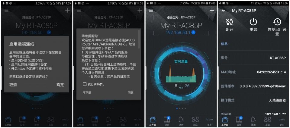 第一次使用,会出现启用远端连线与服务条款的提示,直接确定,同意就可以了。华硕手游路由RT-AC85P的APP软件,界面设计的很美观,而且布局合理。主界面,可以直观的查看实时流量。此外还可以查看路由器型号,固件版本等信息。功能不比通过PC后台差。