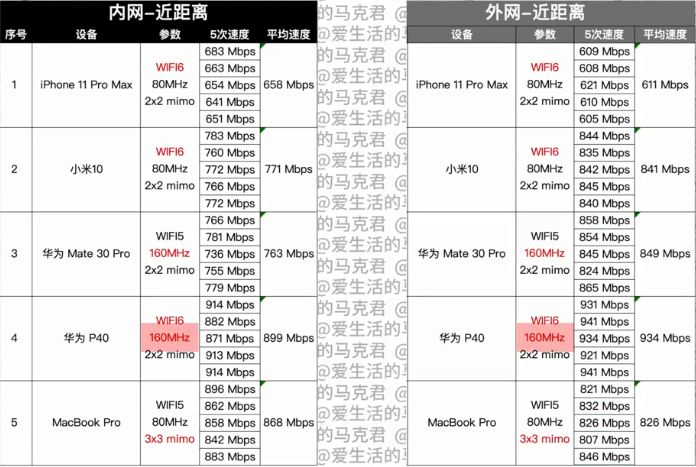 测试用的wifi6手机则在华为P40、iPhone 11 Pro Max、小米10、华为mate30 Pro、Mackbook Pro中,选择了网速最快的华为P40。