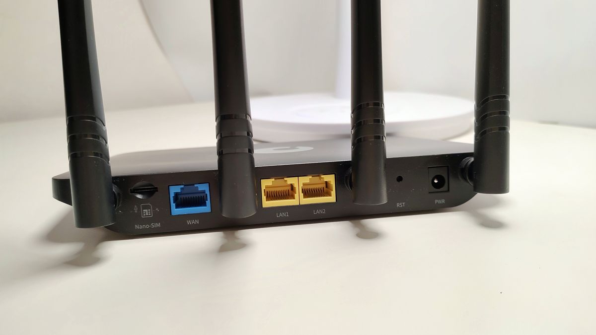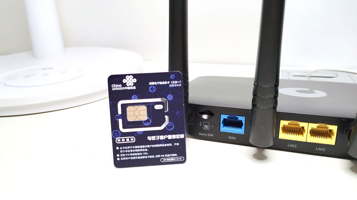 蒲公英X4C的接口端设计在了后面,最左侧为SIM卡槽,我这样,如果不方便拉宽带,或当前环境里没有宽带的话,就可以使用4G转WiFi功能,将SIM卡插入这个卡槽中就可以使用无线了。再往右依次为路由器的WAN接口、两个LAN接口、重置按键、DC供电接口。