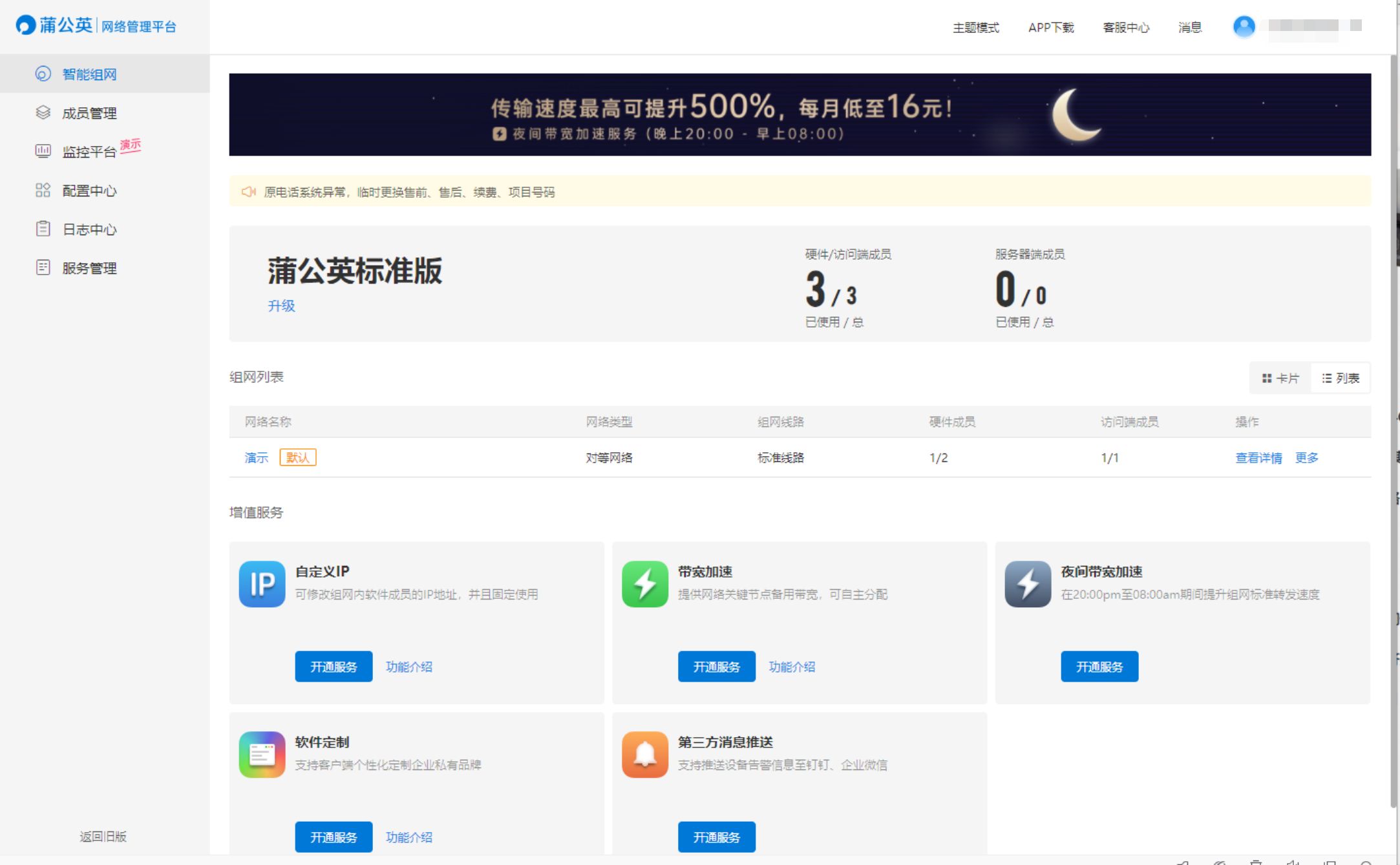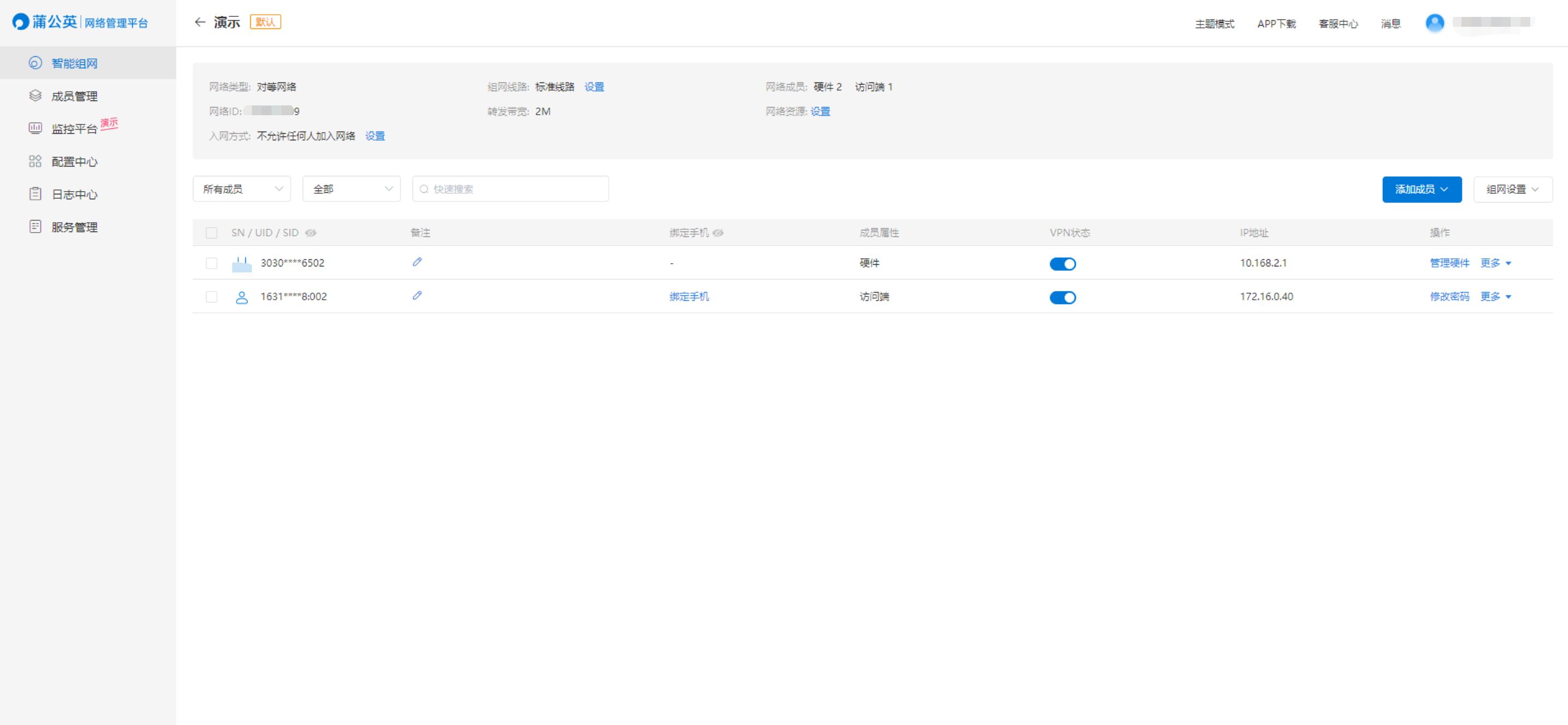 在蒲公英路由器的后台里有一个智能组网功能,点击之后会跳转到蒲公英网络管理平台,通过添加成员处添加绑定路由器为硬件成员,再添加软件成员就算完成了组网。