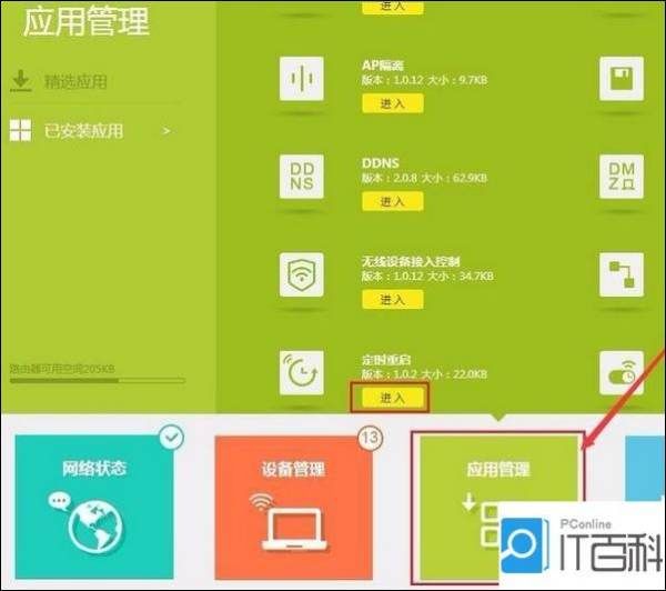 2、登录路由器后,进入应用管理页面,然后找到“ 定时重启 ”图标,点击下面的“ 进入 ”按钮