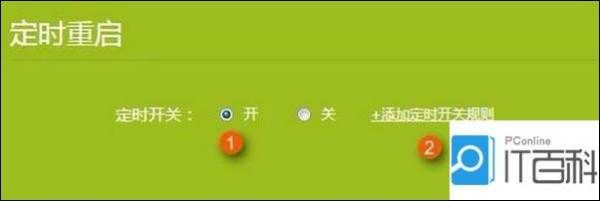 3、这时会弹出定时重启页面,首先选择定时开关状态为“ 开 ”,然后点击“ 添加定时开关规则 ”快捷链接